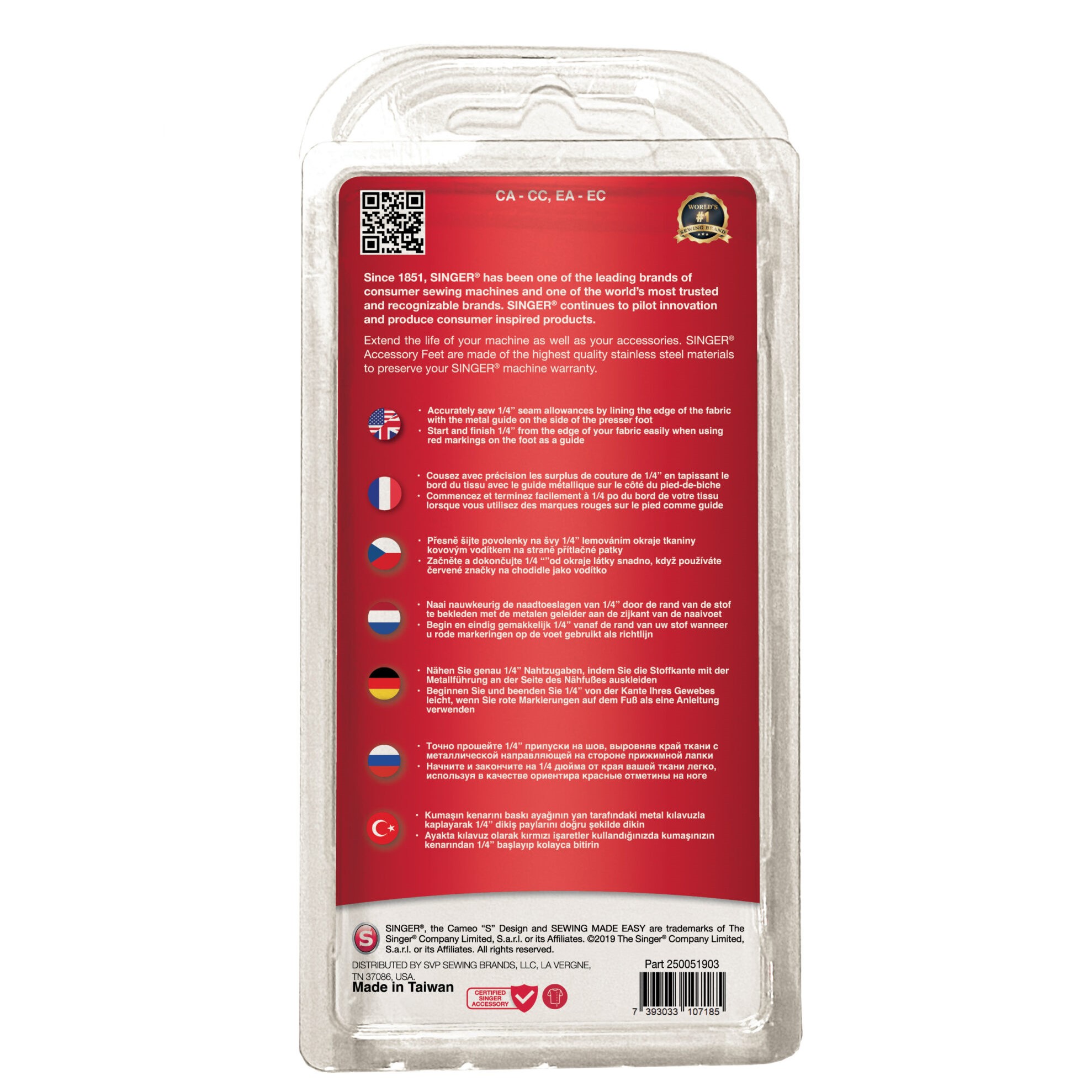 Naai nauwkeurig de naadtoeslagen van 1/4 “door de rand van de stof te bekleden met de metalen geleider aan de zijkant van de naaivoet. Begin en eindig gemakkelijk 1/4 “vanaf de rand van uw stof wanneer u rode markeringen op de voet gebruikt als richtlijn.