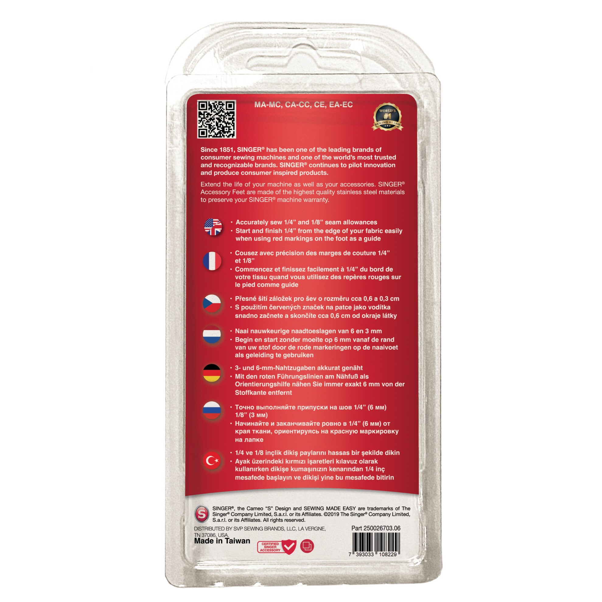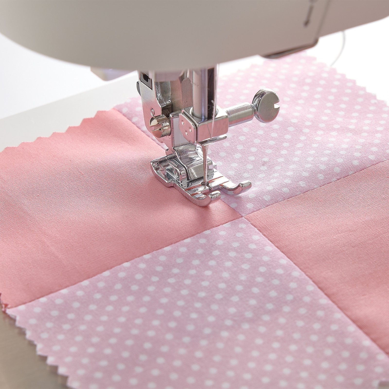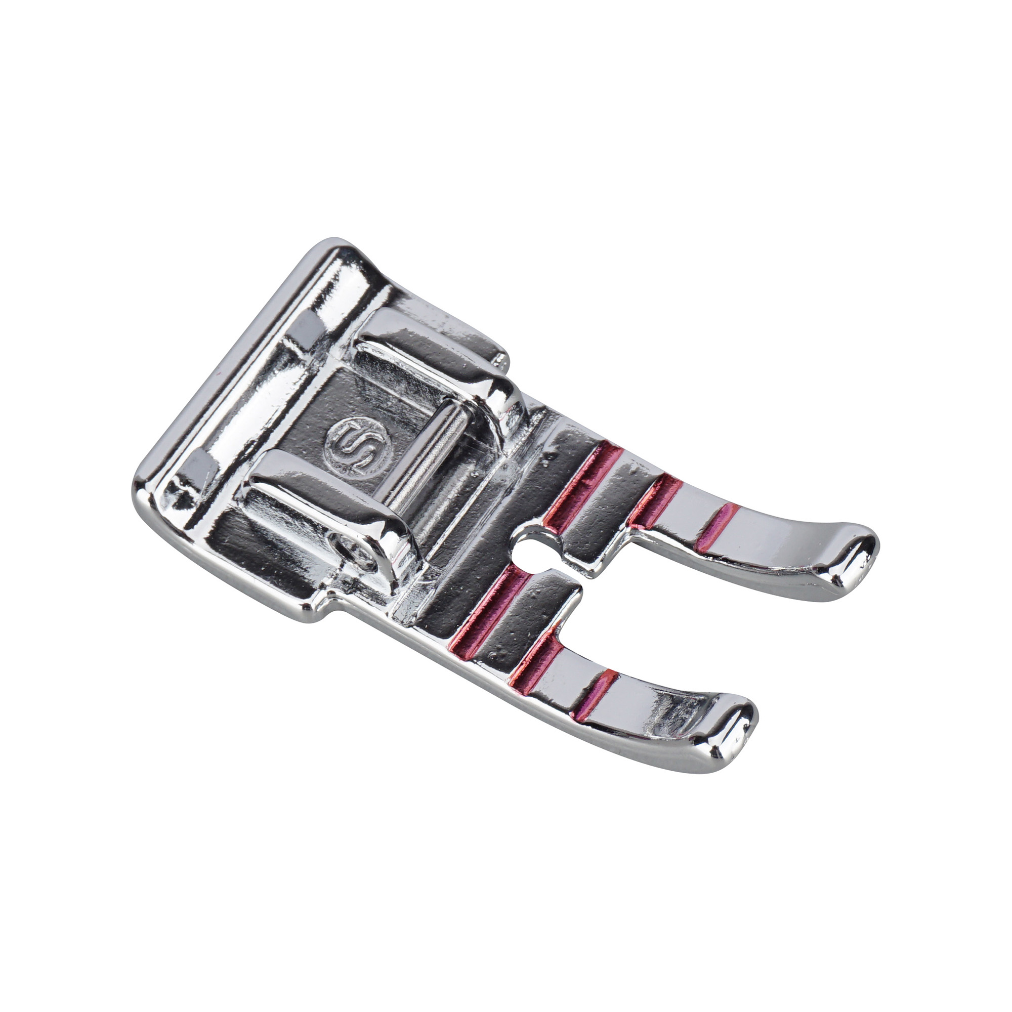Naai nauwkeurige naadtoeslagen van 6 en 3 mm. Begin en start moeiteloos op 6 mm vanaf de rand van uw stof door de rode markeringen op de naaivoet als geleiding te gebruiken.