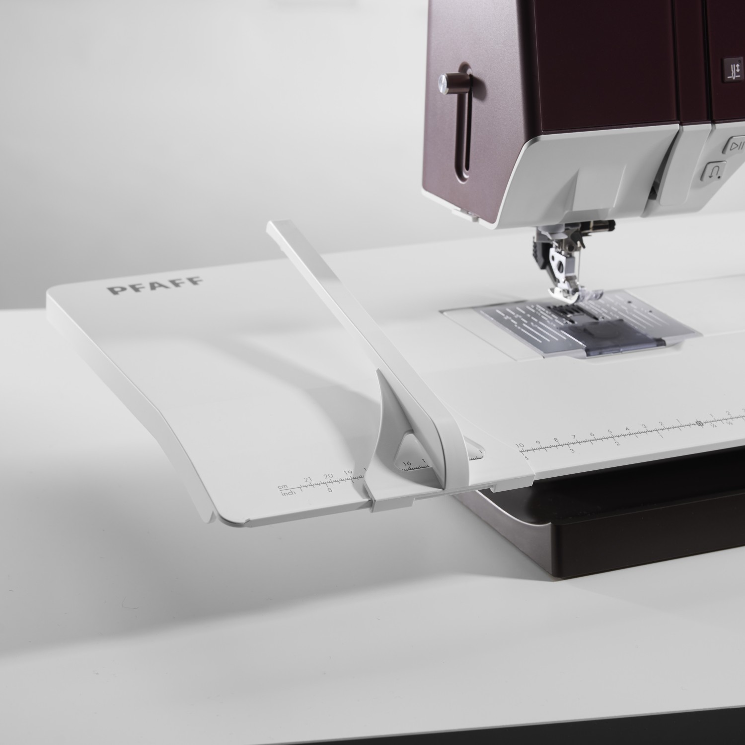 Ontworpen en gefabriceerd voor de PFAFF® expression™ 715, quilt expression™ 725 en creative expression™ 750. Deze aanschuiftafel sluit op dezelfde manier aan op uw machine als de accessoiredoos en vergroot uw werkgebied aanzienlijk. De tafel is erg stabiel en omdat er geen pootjes nodig zijn, heeft u ruimte onder de aanschuiftafel voor ronde projecten. De verstelbare geleider met liniaal heeft zowel centimeters als inches om u zomen, randen en meer te laten naaien met perfecte nauwkeurigheid. De liniaal is direct op de aanschuiftafel gedrukt en meet vanaf de naald in zowel centimeters als inches zodat u altijd de benodigde maten bij de hand heeft.
