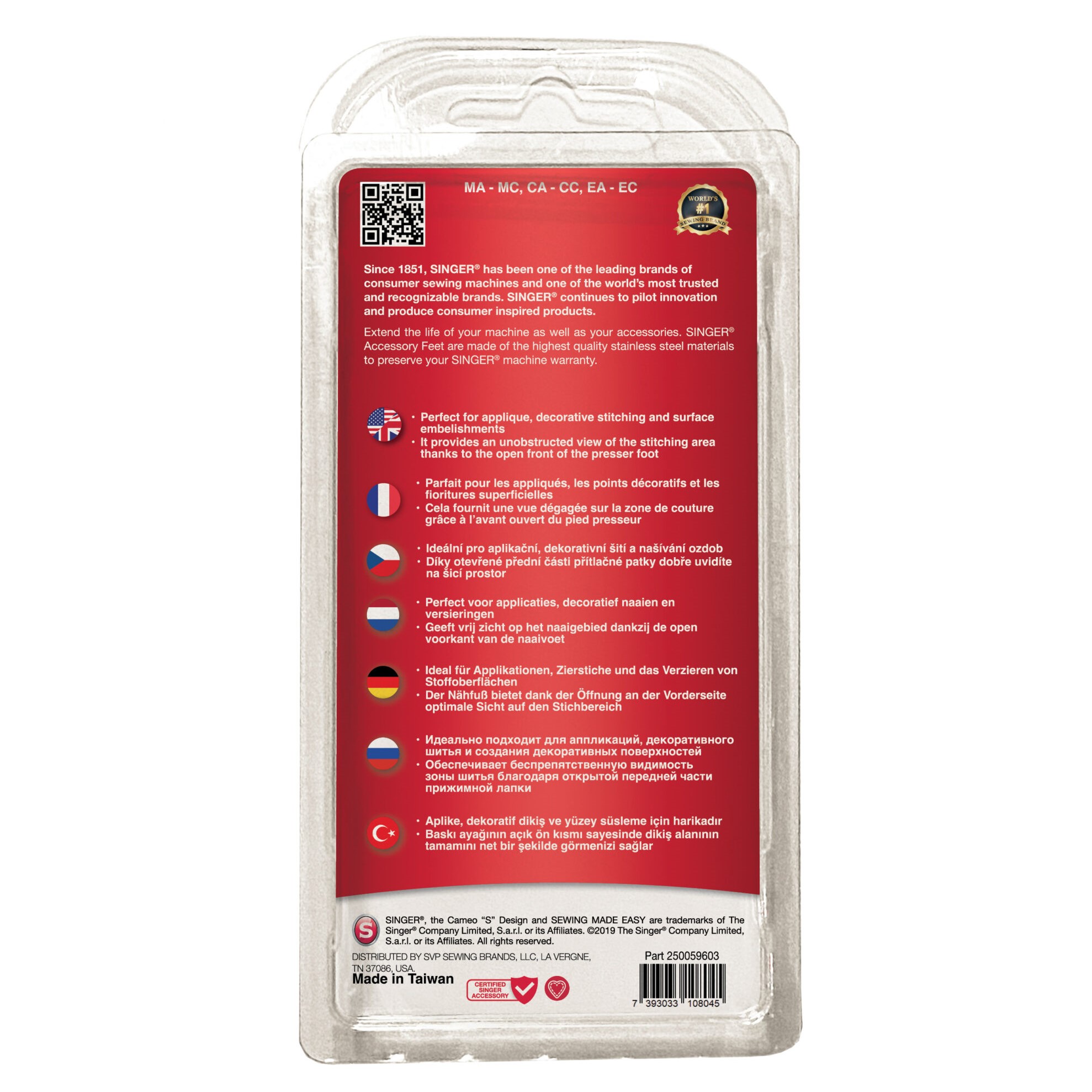 Perfect voor applicaties, decoratief naaien en versieringen. Geeft vrij zicht op het naaigebied dankzij de open voorkant van de naaivoet.