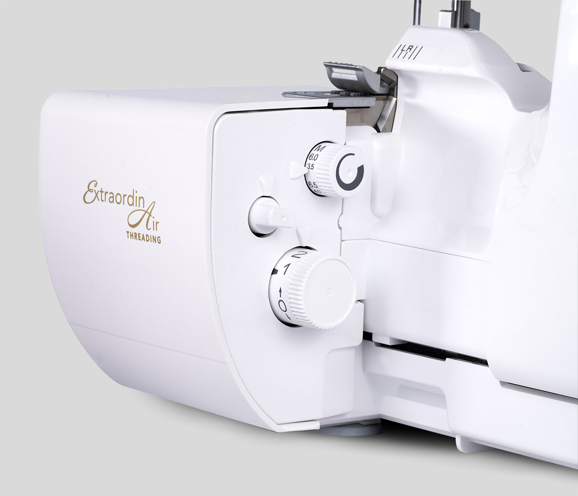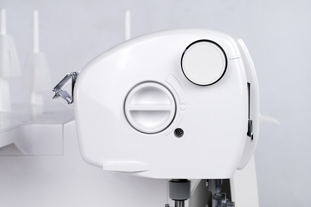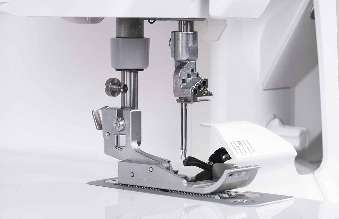 Wanneer de knop voor het aanpassen van de steekbreedte met de klok mee of tegen de klok in wordt gedraaid, bewegen de kettingtong en het bovenmes synchroon naar rechts of links. Dankzij deze speciale technologie kan de naadbreedte eenvoudig worden aangepast. De daadwerkelijke naadbreedte wordt gewijzigd en niet alleen de snijbreedte, zoals gewoonlijk het geval is. Over- of ondersnijdingen worden voorkomen en het is niet nodig om de hoeveelheid lusdraad aan te passen. De steek wordt breder of smaller zonder vervelende en tijdrovende aanpassingen.