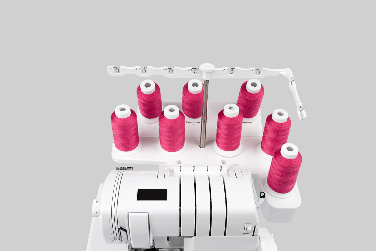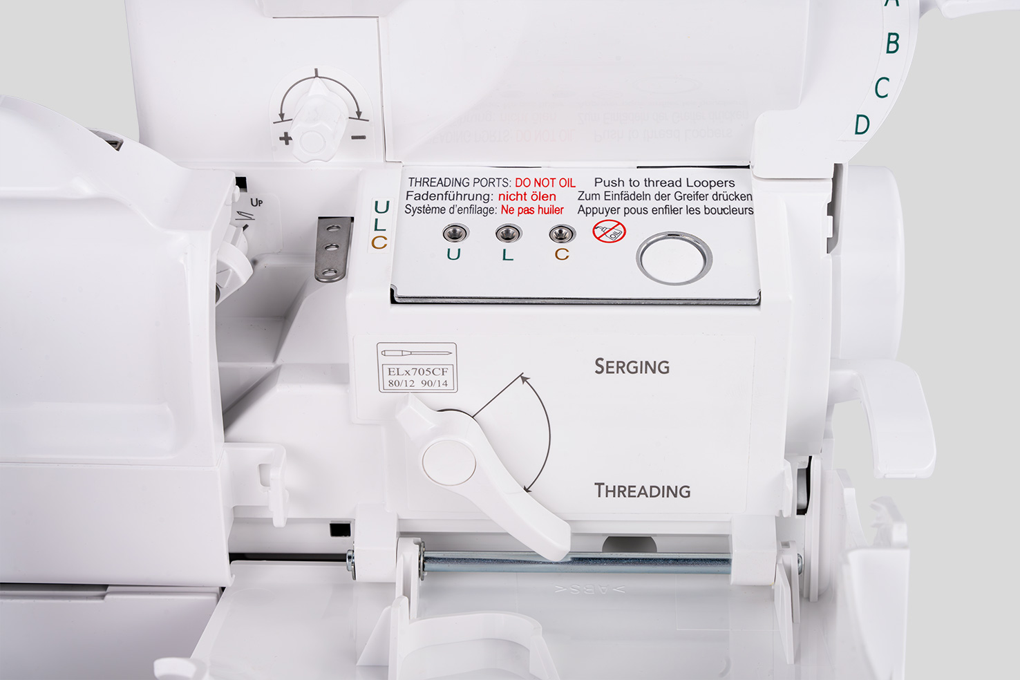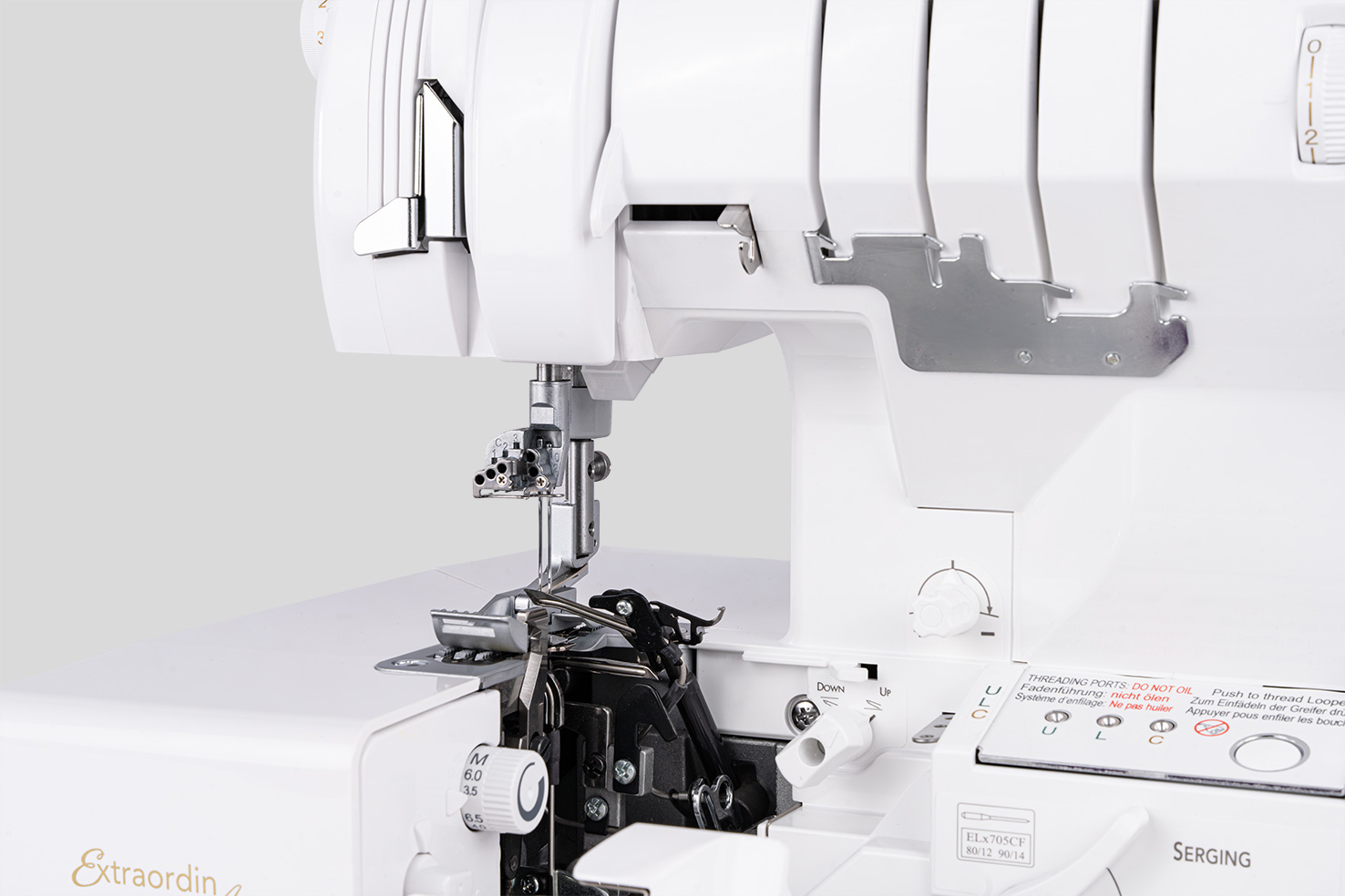 Wanneer de knop voor het aanpassen van de steekbreedte met de klok mee of tegen de klok in wordt gedraaid, bewegen de kettingtong en het bovenmes synchroon naar rechts of links. Dankzij deze speciale technologie kan de naadbreedte eenvoudig worden aangepast. De daadwerkelijke naadbreedte wordt gewijzigd en niet alleen de snijbreedte, zoals gewoonlijk het geval is. Over- of ondersnijdingen worden voorkomen en het is niet nodig om de hoeveelheid lusdraad aan te passen. De steek wordt breder of smaller zonder vervelende en tijdrovende aanpassingen.