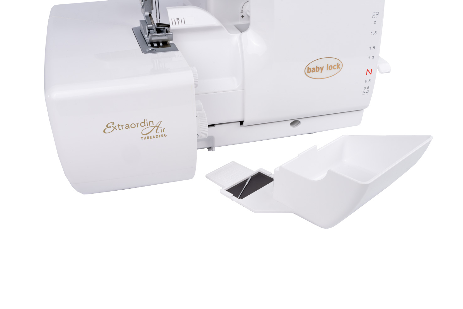 De Aspire wordt geleverd met de nieuwste generatie baby lock opvangbak. De naaldopvangbak is direct in deze bak geïntegreerd. De opvangbak is op dit punt ook verbonden met de machine. De clou: de opvangbak kan op de machine blijven tijdens het inrijgen van de grijpers en alle stelknoppen zijn altijd toegankelijk.