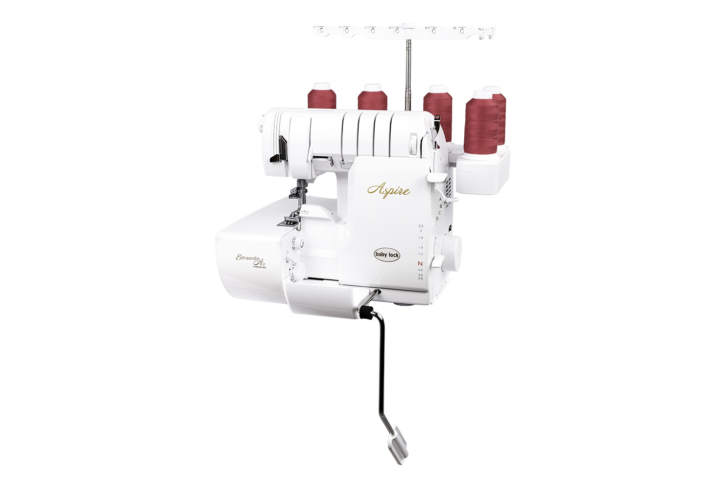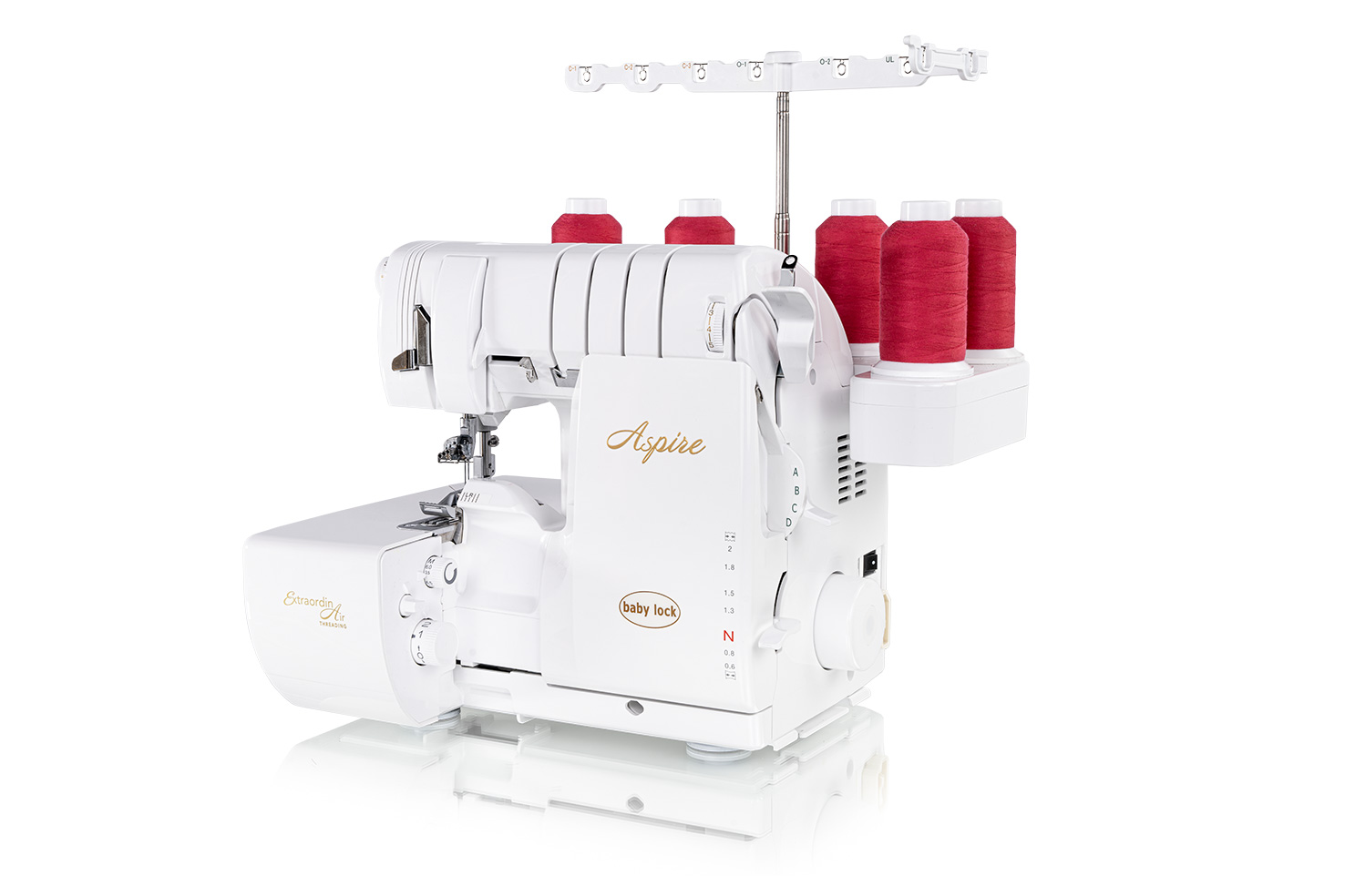 De Aspire is uitgerust met het ExtraordinAir-systeem. Met dit laatste inrijgsysteem van baby lock worden overlock- en covergrijpers in een handomdraai ingeregen met één druk op de knop. De Aspire heeft ook geoptimaliseerde inrijgroutes en draadgeleiders. Een vereenvoudigde geleider voor de naalddraden en een verbeterd inrijgroute voor de covergrijper zorgen ervoor dat bulkgaren of andere dikkere decoratieve garens nog gemakkelijker ingeregen kunnen worden.