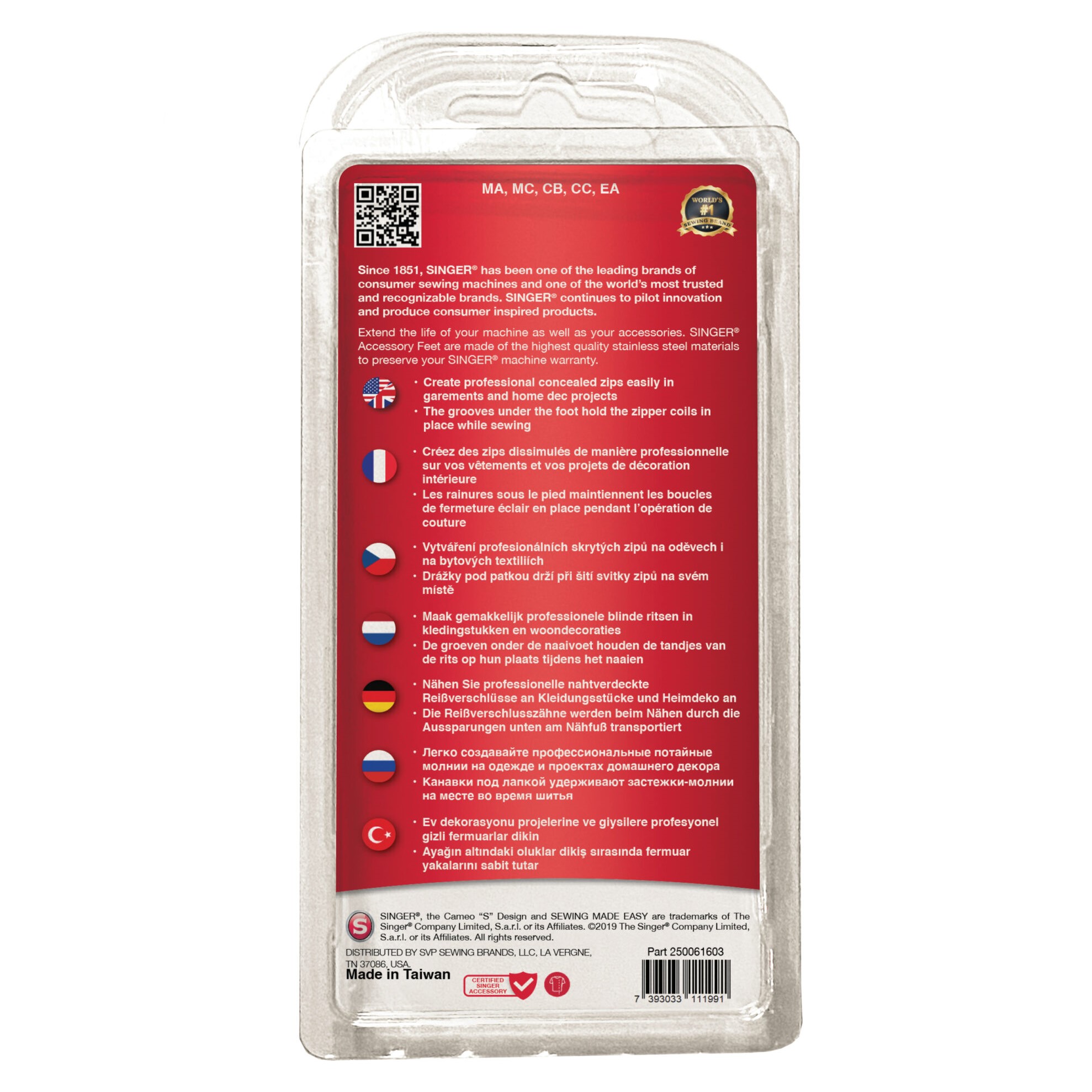 Maak gemakkelijk professionele blinde ritsen in kledingstukken en woondecoraties. De groeven onder de naaivoet houden de tandjes van de rits op hun plaats tijdens het naaien.