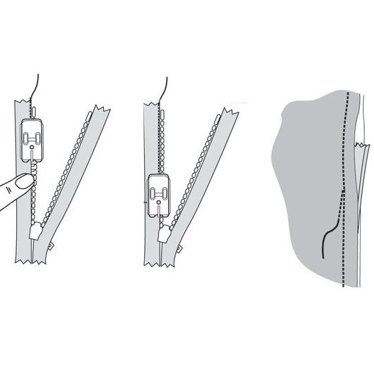 - Trek het lipje van de rits omhoog. Plaats de stof met de goede kanten van de stof op elkaar. Plaats het gewone ritsvoetje links van de naald. Wijzig de naaldpositie naar de rechterzijde. Naai de naad onder de rits. Wanneer de rits te lang is, naai dan 3 cm onder de markering met de hand over de ritstenen. Knip het overtollige ritsdeel onder de met de hand genaaide steek af.