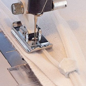 - Plaats het linker gedeelte van de rits op de linkerzijde van het kledingstuk met de goede kanten op elkaar. Breng het naaivoetje omlaag met de ritstenen in de linker gleuf. Zorg ervoor dat de naald weer perfect is uitgelijnd met de naaldgeleider op het voetje. Naai op dezelfde manier als de rechter zijde.