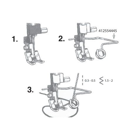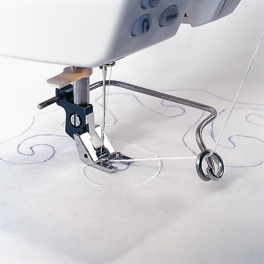 Gebruik de contourdraadvoet voor een cordonsteektechniek met reliëf. De contourdraad wordt door de voet geleid terwijl de steek eroverheen wordt genaaid.