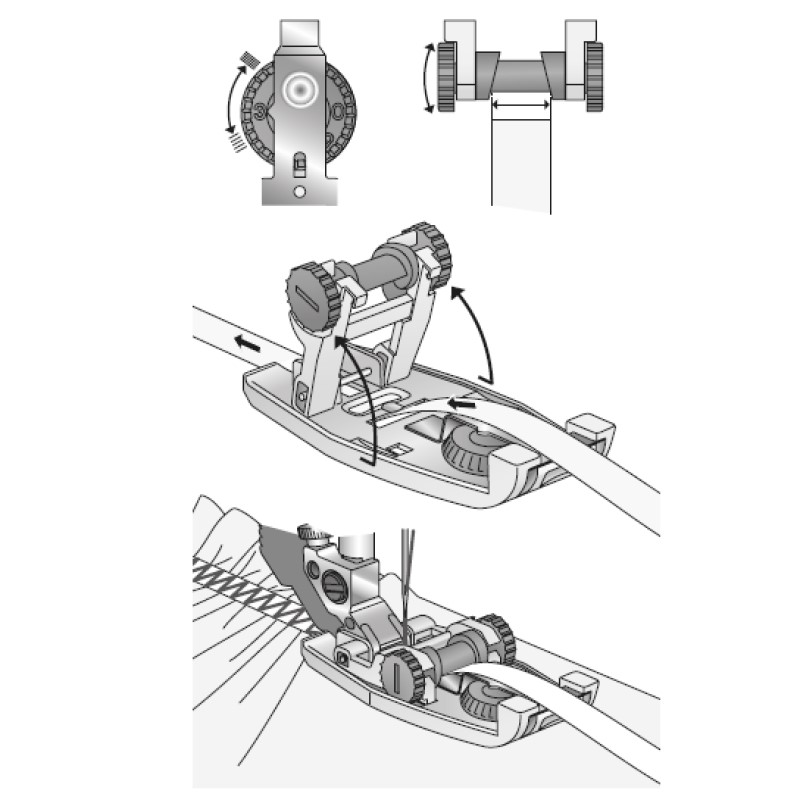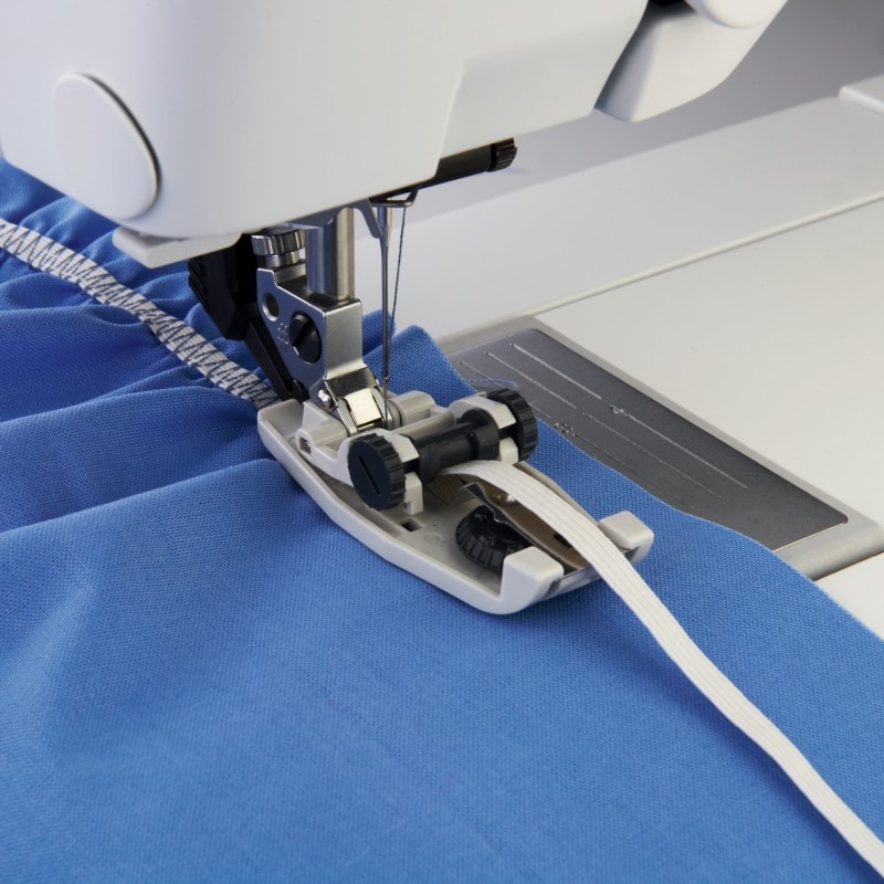 De elastiekvoet transporteert en rekt in één beweging 6 tot 12 mm breed elastiek op en naait dit vast. Ideaal voor sportkleding, lingerie en andere technieken waarbij elastiek wordt gebruikt.