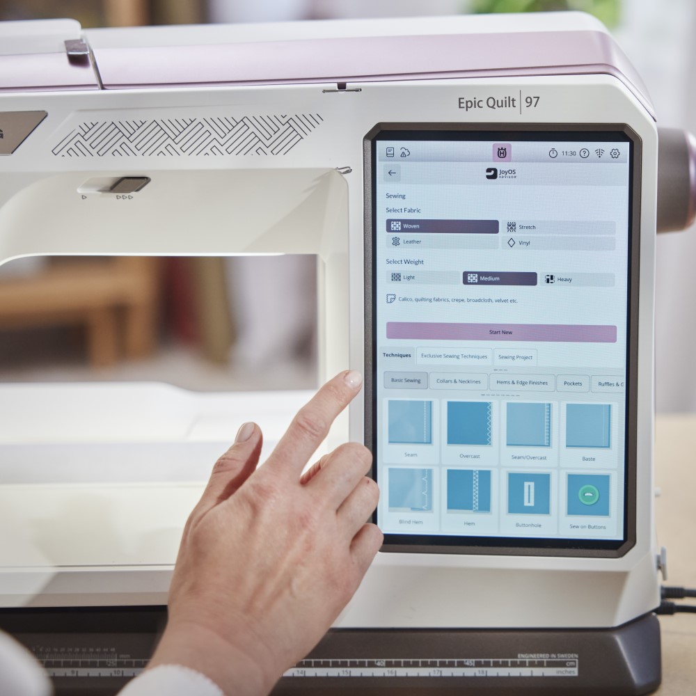 De JoyOS ADVISOR functie biedt begeleiding en ondersteuning binnen handbereik. Selecteer uw type stof en kies uit een brede selectie beschikbare naaitechnieken. De JoyOS ADVISOR functie stelt direct de beste steek-breedte, steeklengte, draadspanning/-hoeveelheid en naaivoetdruk in voor de techniek die u heeft gekozen.