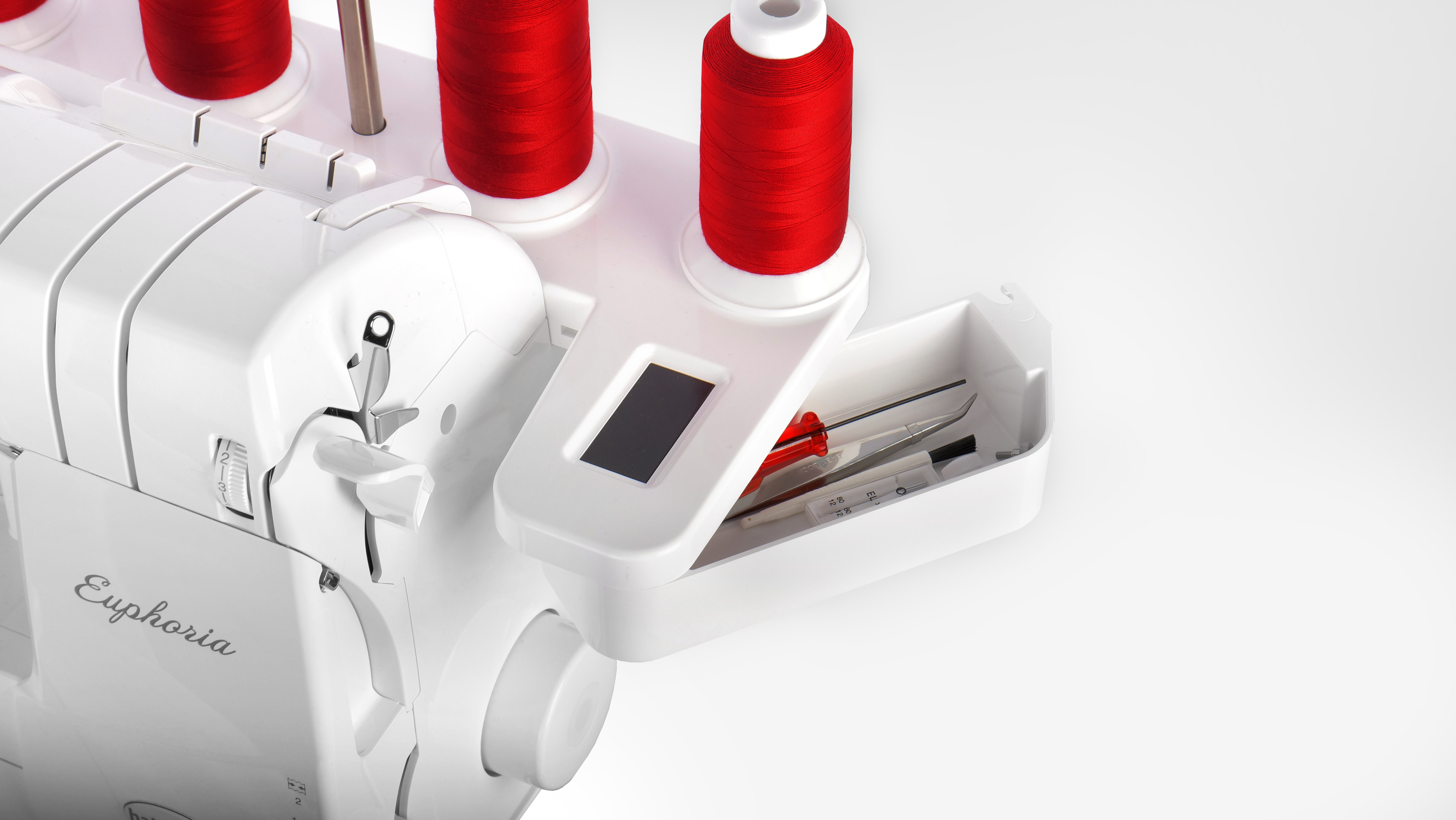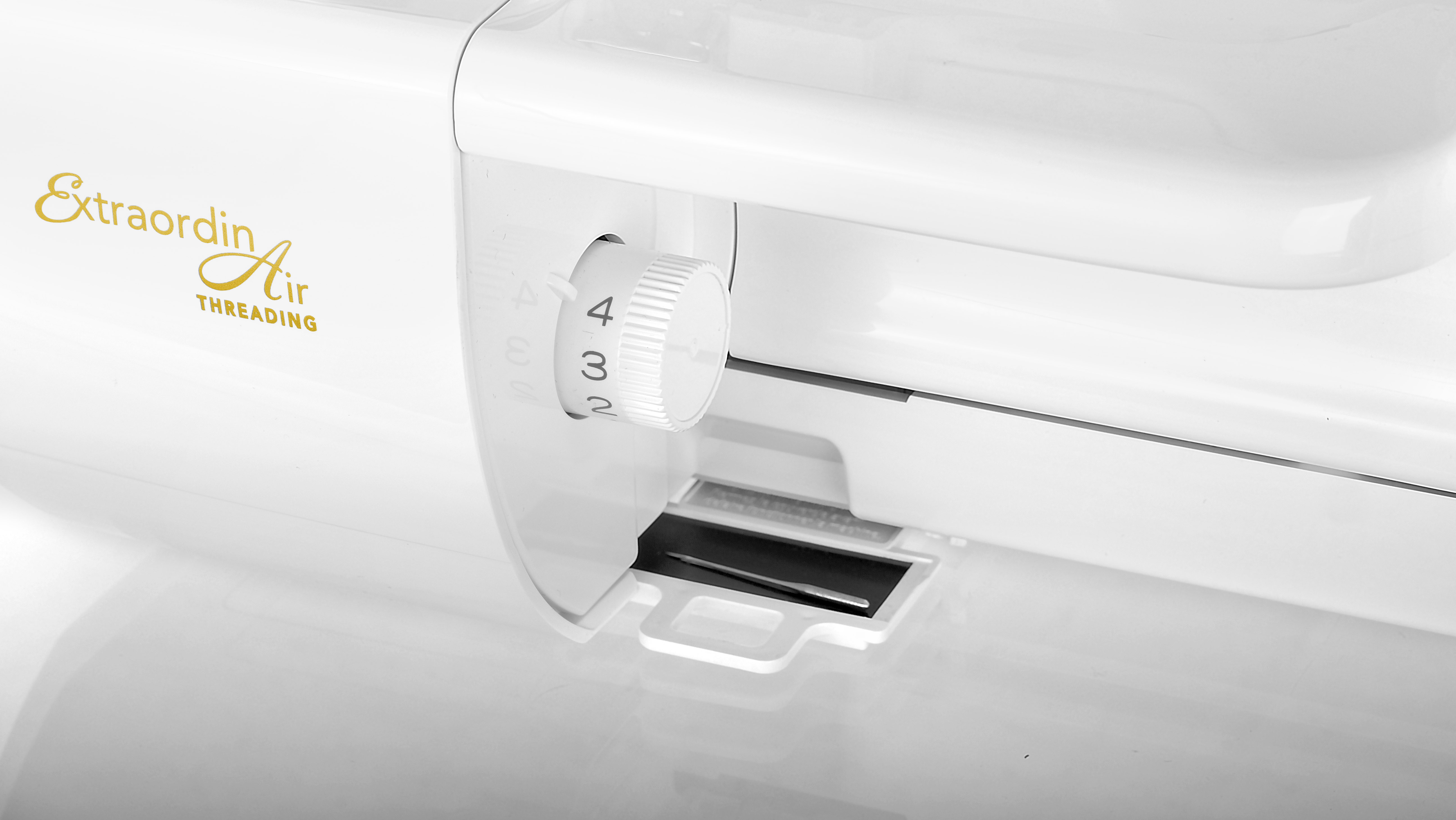 De Euphoria heeft een innovatief luchtinrijgsysteem. Met het ExtraordinAir-systeem rijgt een compressor, die met één druk op de knop wordt geactiveerd, de grijperdraad betrouwbaar en snel in. Het heeft ook een ingenieuze mechanische naaldinrijger, waardoor de draden in slechts drie eenvoudige stappen in het juiste oog terechtkomen. Beide systemen zorgen ervoor dat het inrijgen van de Euphoria kinderspel is. Selecteer gewoon de gewenste draad, breng deze in, druk op de bijbehorende knop en de draad wordt automatisch ingeregen.