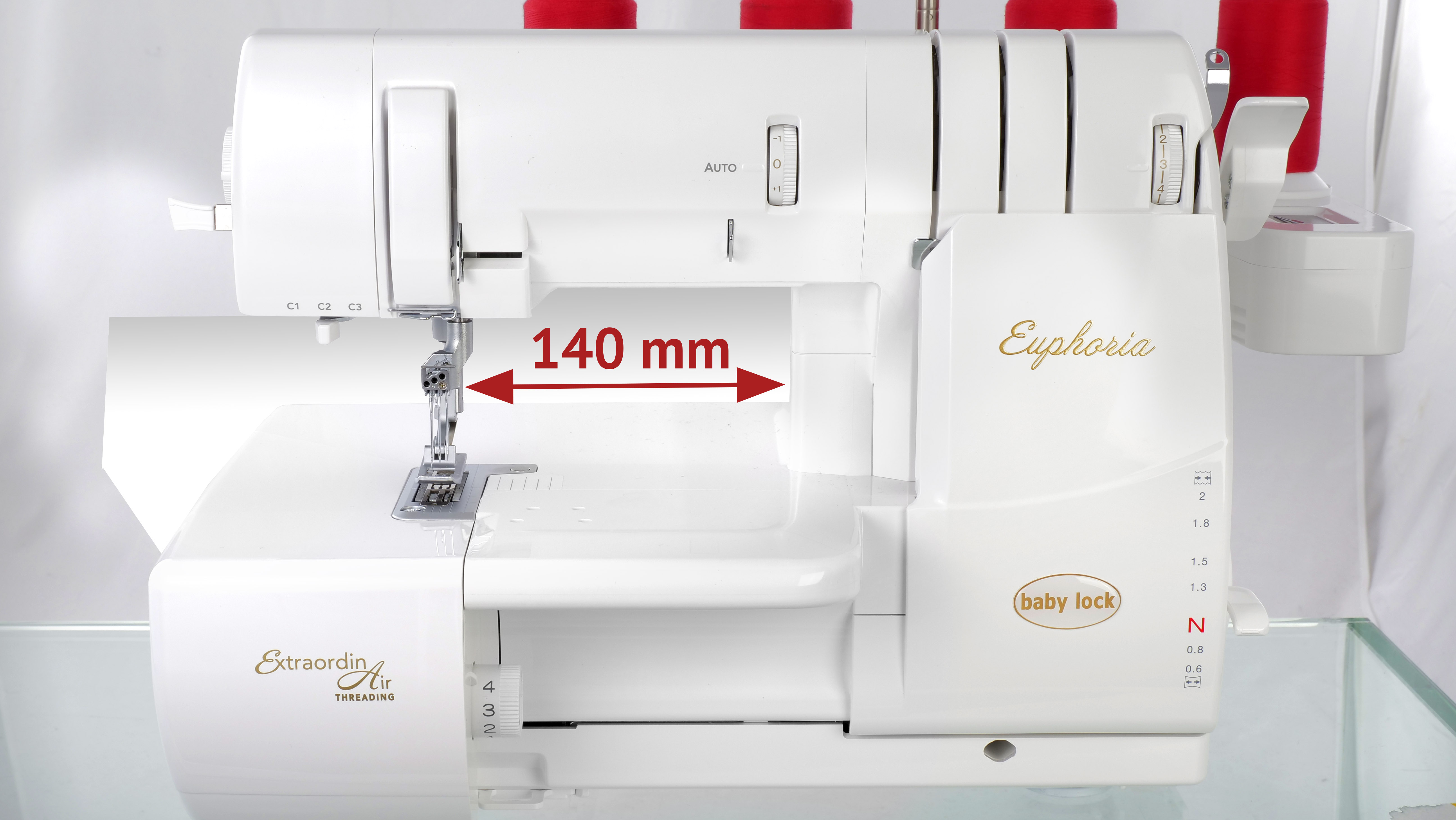 Meer vrijheid voor je creatieve projecten! Dankzij de extra brede opening van de Euphoria kun je zelfs grotere naaiprojecten met gemak realiseren. Grote hoeveelheden stof kunnen gemakkelijk worden verwerkt of zelfs worden versierd met covernaden dankzij de 140 mm brede opening.