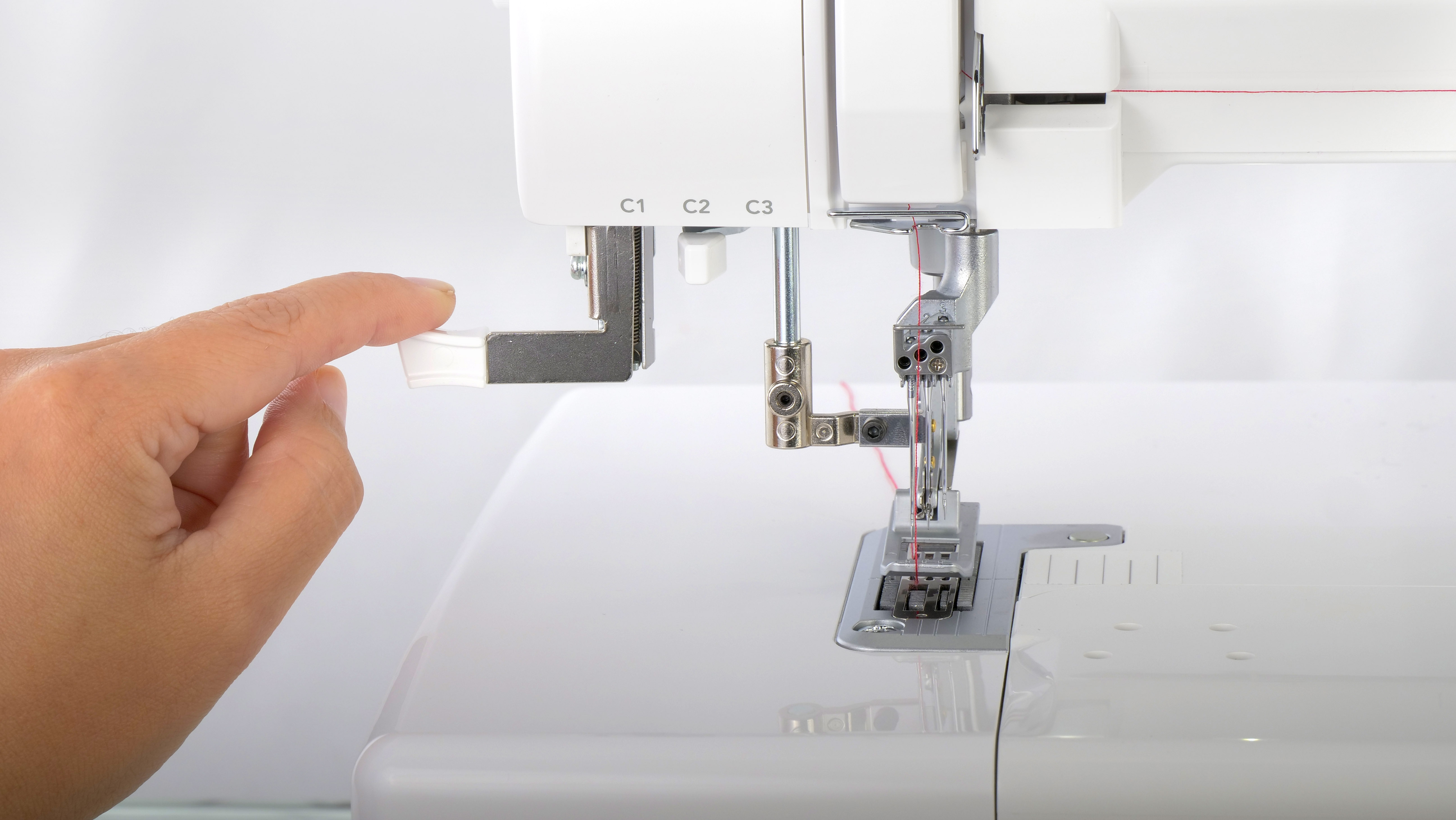 Wanneer de naaivoet omhoog wordt gebracht, zakt de transporteur automatisch. Deze technologie zorgt ervoor dat covernaden moeiteloos kunnen worden afgewerkt. De afstand tussen de naaivoet en de transporteur wordt vergroot, waardoor de stof gemakkelijker kan worden verplaatst. Terwijl je op de stof naait tijdens het coveren, kan de naad individueel worden afgewerkt waar jij dat wilt of waar het naaiproject dat vereist.