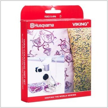Met de Garendecoratie set van HUSQVARNA® VIKING® kunt u eenvoudig decoratieve draadversieringen naaien uit de vrije hand of borduren. De twee verschillende naaivoeten zijn geschikt voor veel verschillende soorten draad. Instructies worden meegeleverd.