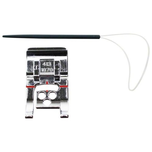 Opmerking: decoratieve steken die voorwaartse beweging gebruiken, werken het beste (vermijd steken met te veel achterwaartse beweging). - Rijg decoratieve koorden of garen in de gaten vanaf de bovenkant van de voet, met behulp van de gareninrijger, voordat u de voet op de naaimachine bevestigt.