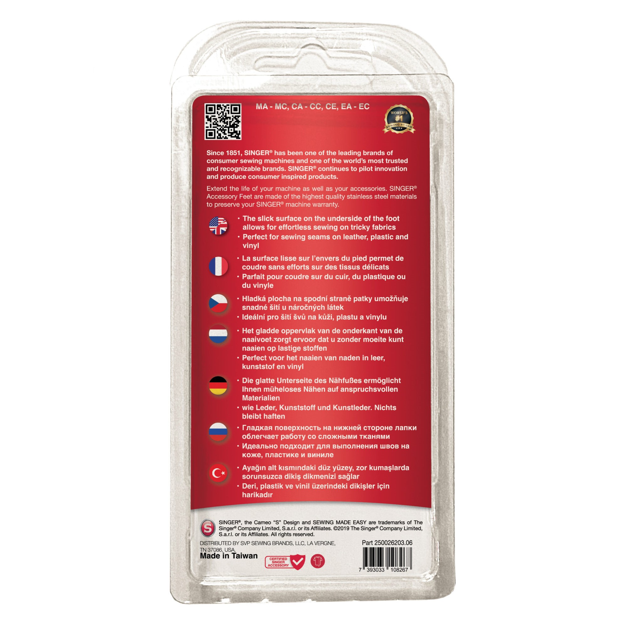Het gladde oppervlak van de onderkant van de naaivoet zorgt ervoor dat u zonder moeite kunt naaien op lastige stoffen. Perfect voor het naaien van leer, kunststof en vinyl.
