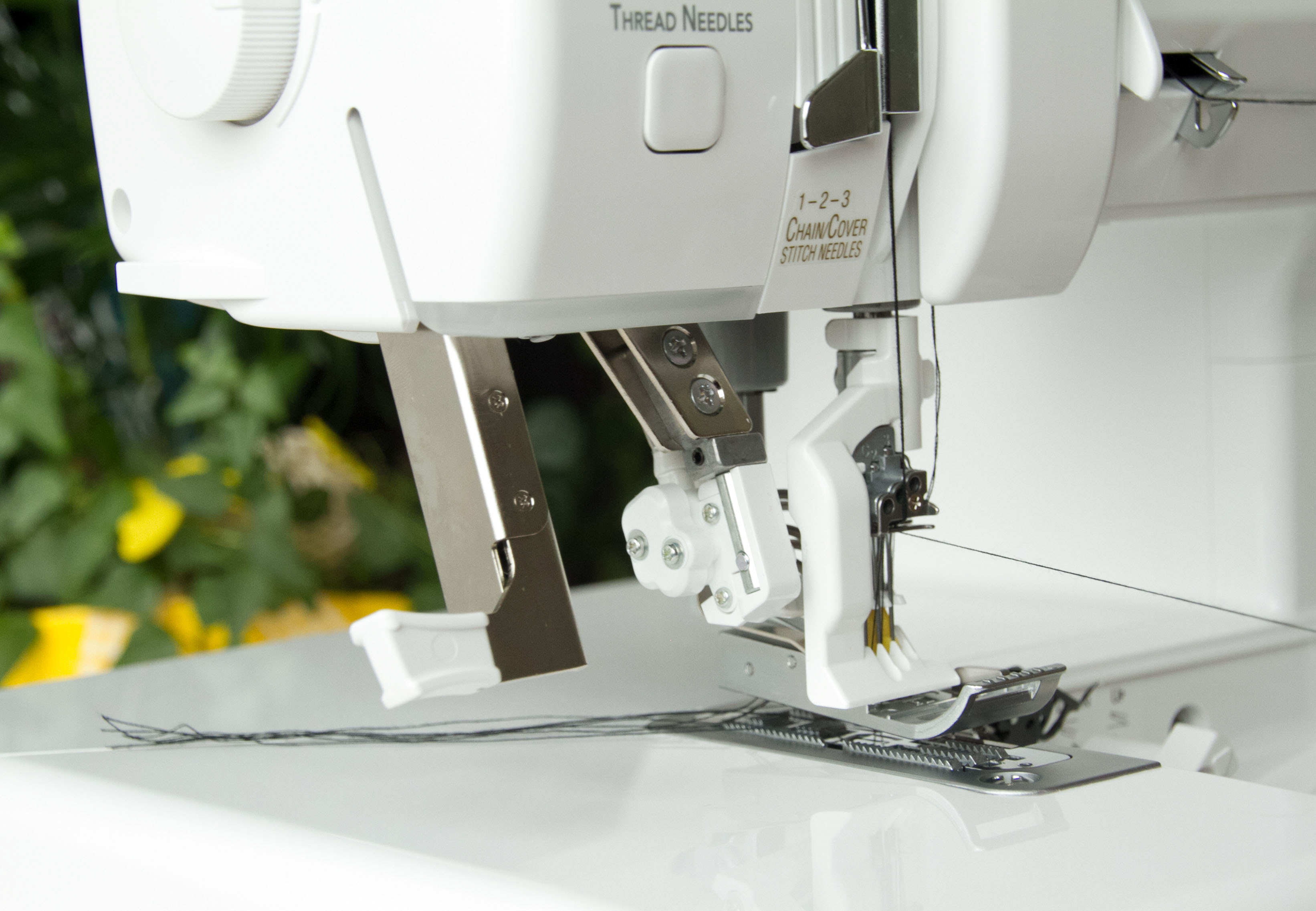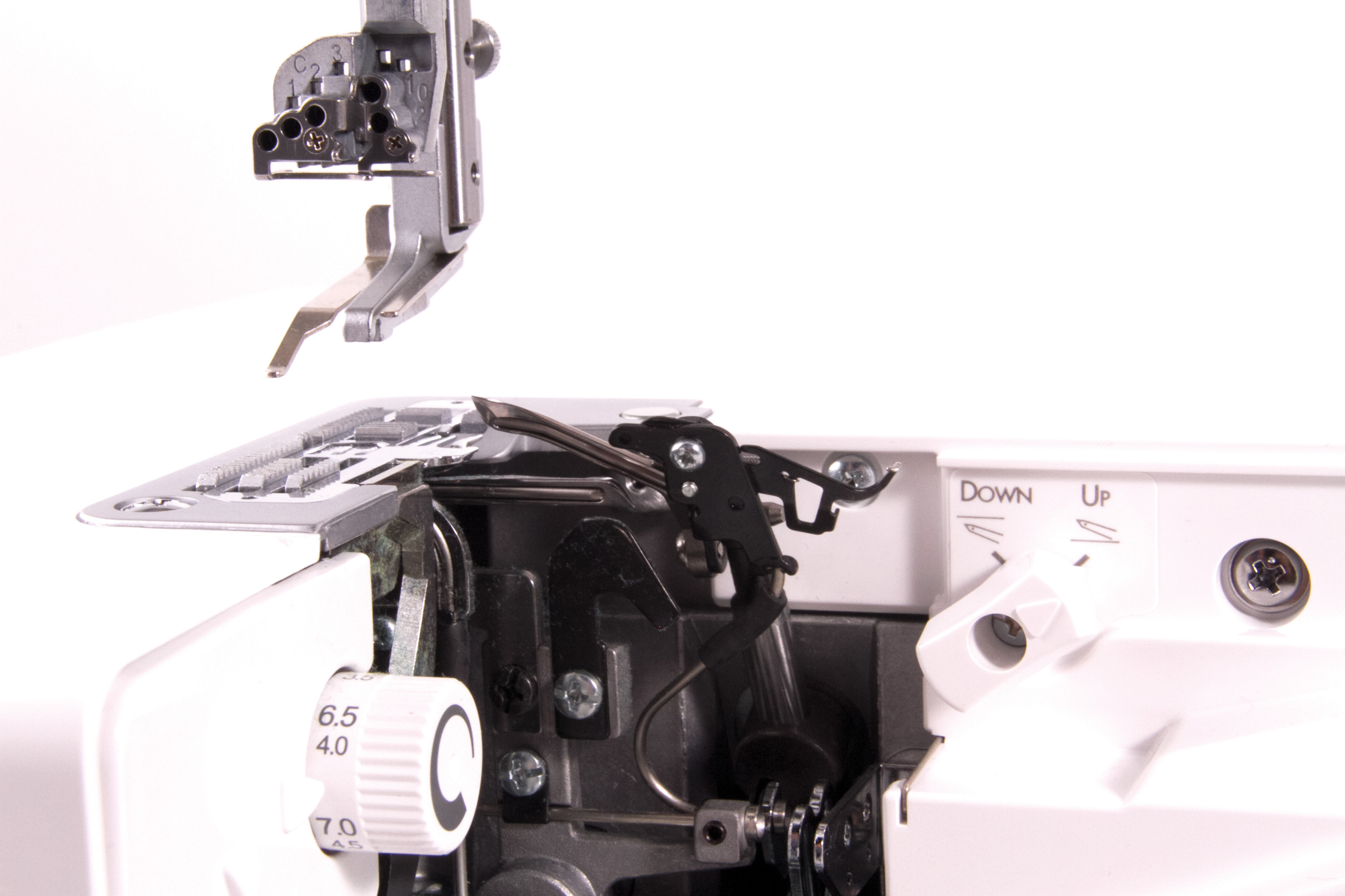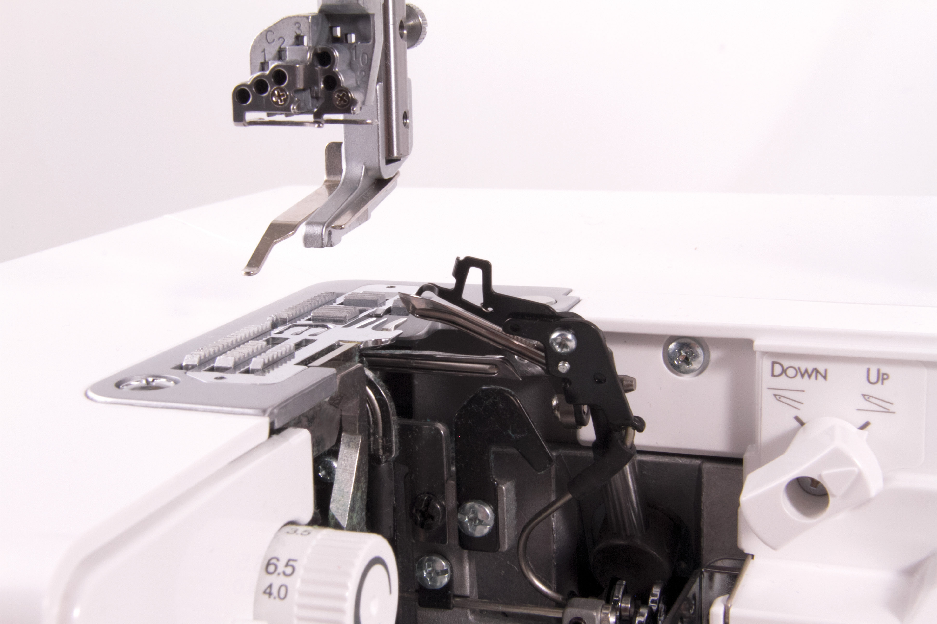Wanneer de knop voor het aanpassen van de steekbreedte met de klok mee of tegen de klok in wordt gedraaid, bewegen de kettingtong en het bovenmes synchroon naar rechts of links. Dankzij deze speciale technologie kan de naadbreedte eenvoudig worden aangepast. De daadwerkelijke naadbreedte wordt gewijzigd en niet alleen de snijbreedte, zoals gewoonlijk het geval is. Over- of ondersnijdingen worden voorkomen en het is niet nodig om de hoeveelheid lusdraad aan te passen. De steek wordt breder of smaller zonder vervelende en tijdrovende aanpassingen.