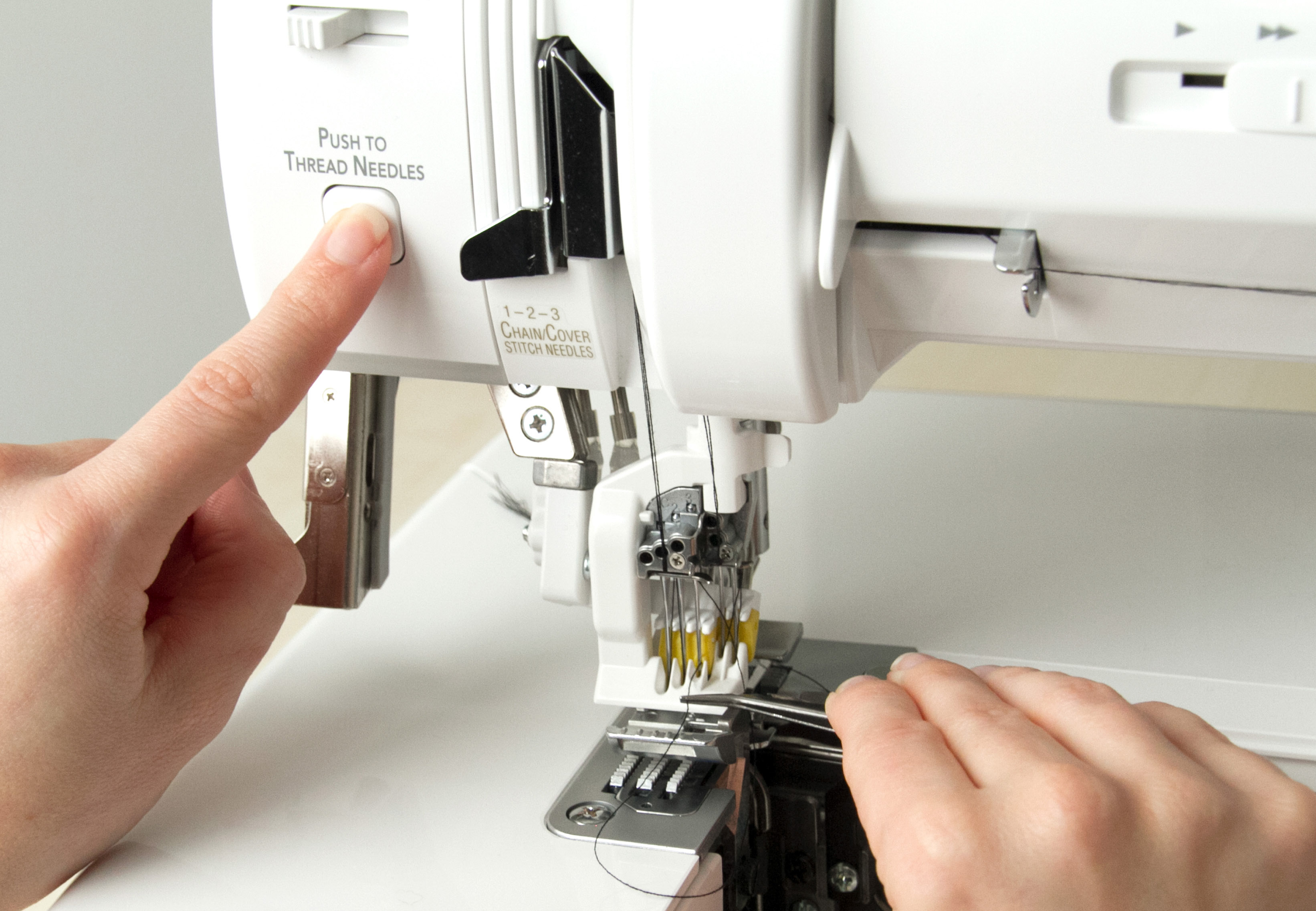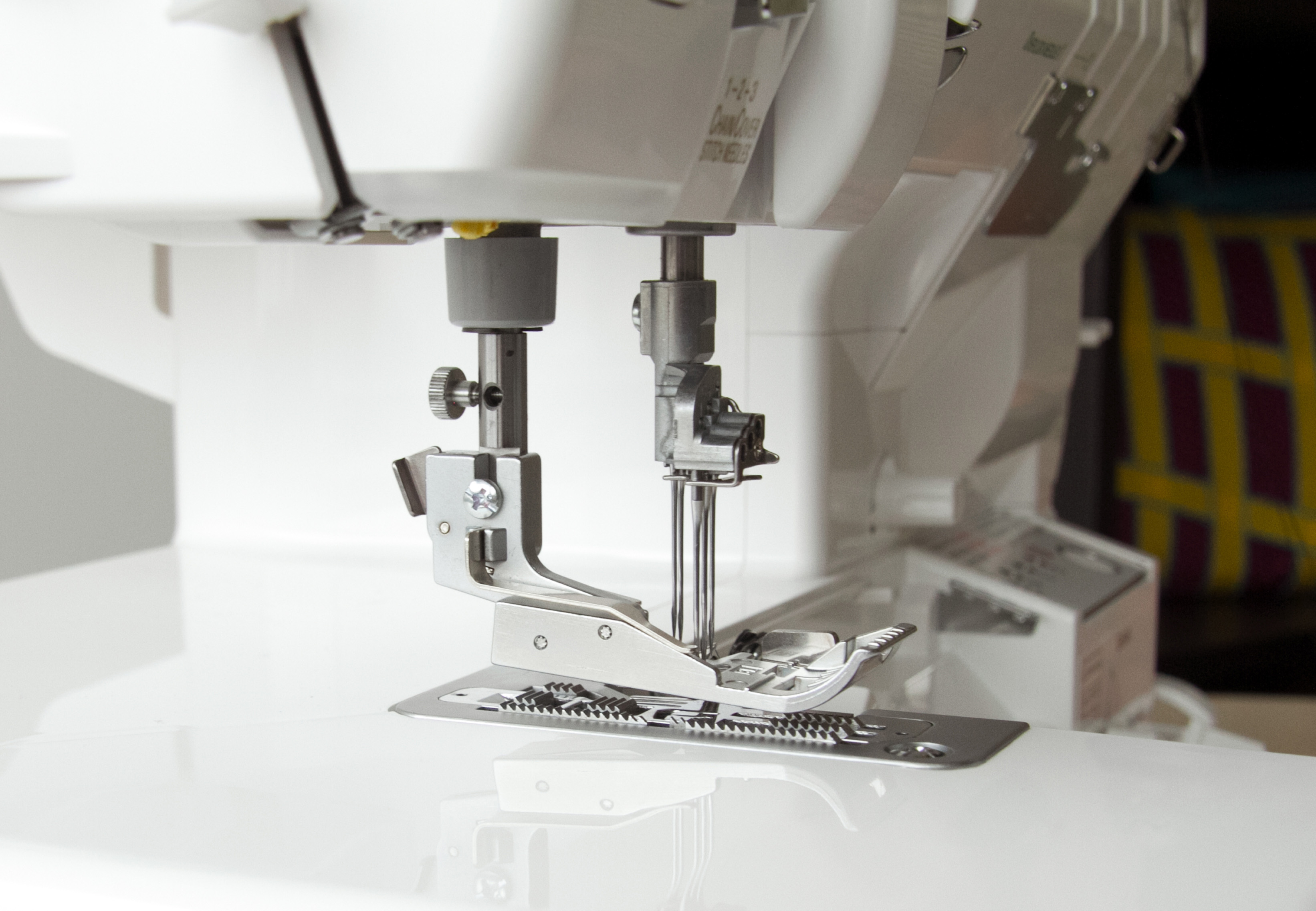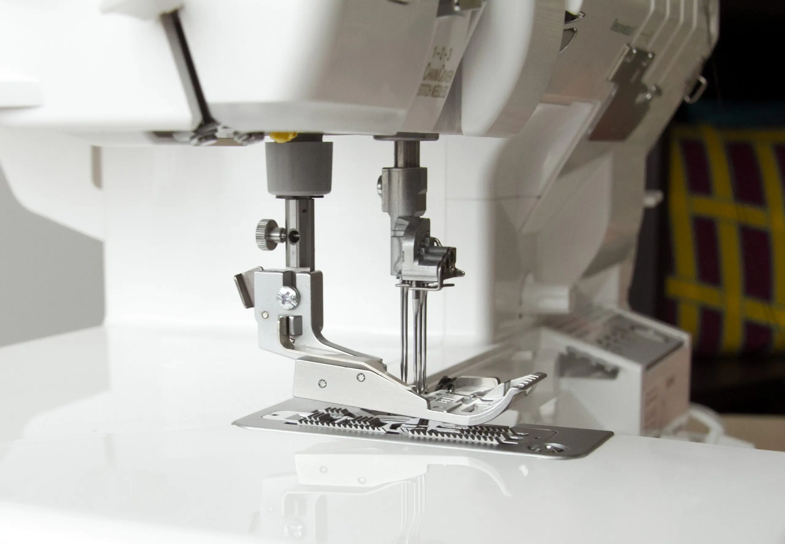Wanneer de knop voor het aanpassen van de steekbreedte met de klok mee of tegen de klok in wordt gedraaid, bewegen de kettingtong en het bovenmes synchroon naar rechts of links. Dankzij deze speciale technologie kan de naadbreedte eenvoudig worden aangepast. De daadwerkelijke naadbreedte wordt gewijzigd en niet alleen de snijbreedte, zoals gewoonlijk het geval is. Over- of ondersnijdingen worden voorkomen en het is niet nodig om de hoeveelheid lusdraad aan te passen. De steek wordt breder of smaller zonder vervelende en tijdrovende aanpassingen.