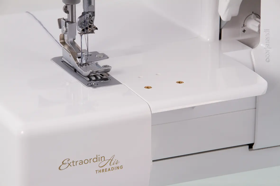 Naast de bekende kenmerken van de succesvolle baby Lock coverlockmachines, beschikt het over het zogenaamde RevolutionAirTM systeem. Dit luchtinrijgsysteem zorgt voor snel en eenvoudig inrijgen van de grijpers en nu zelfs het naaldoog in slechts een paar eenvoudige stappen.