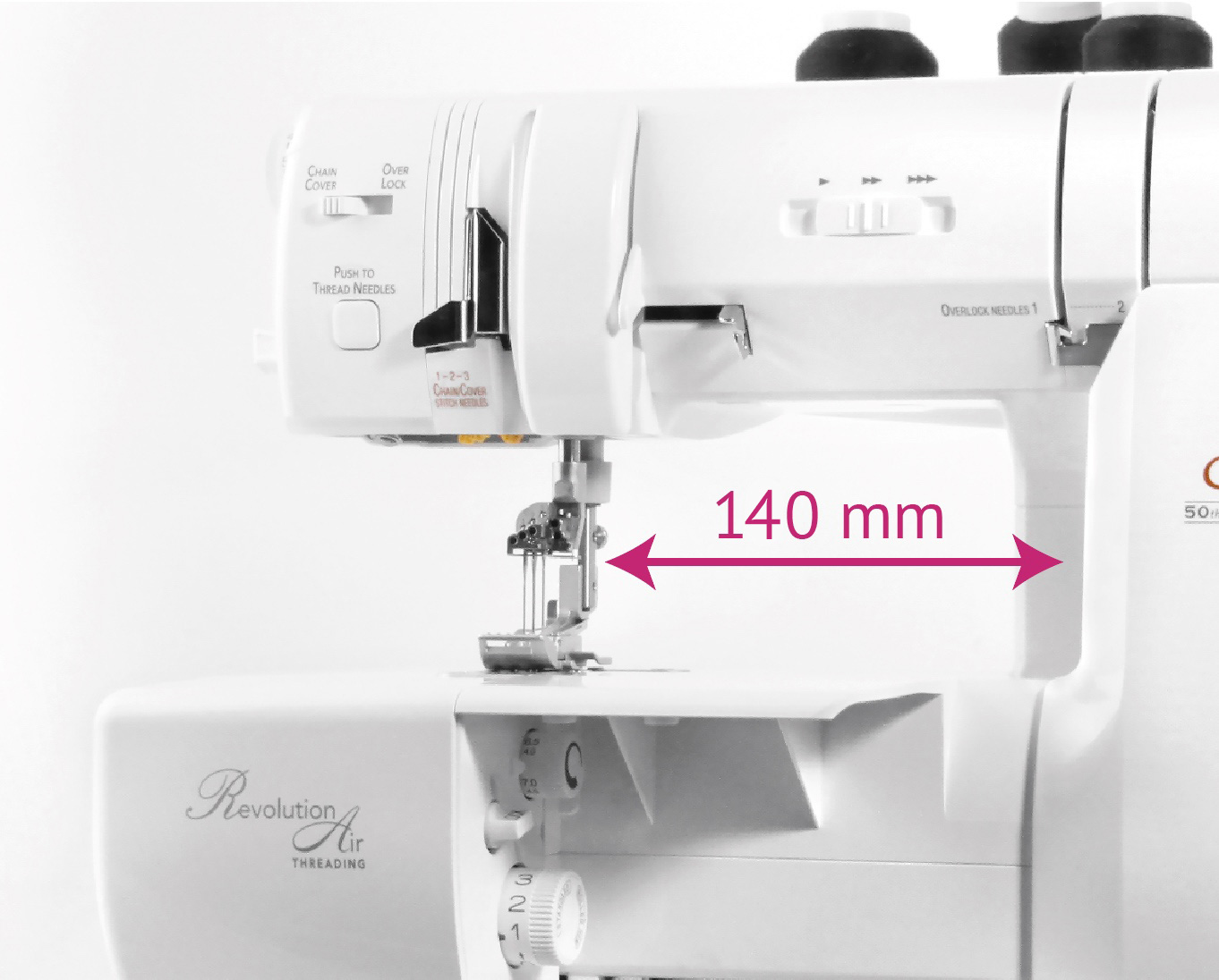 Meer vrijheid voor uw creatieve projecten! Dankzij de extra brede opening van de Gloria kun je zelfs grotere naaiprojecten met gemak realiseren. Grote hoeveelheden stof kunnen gemakkelijk worden verwerkt of zelfs worden versierd met covernaden dankzij de 140 mm brede opening.