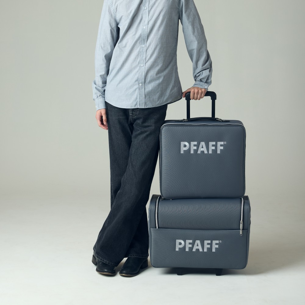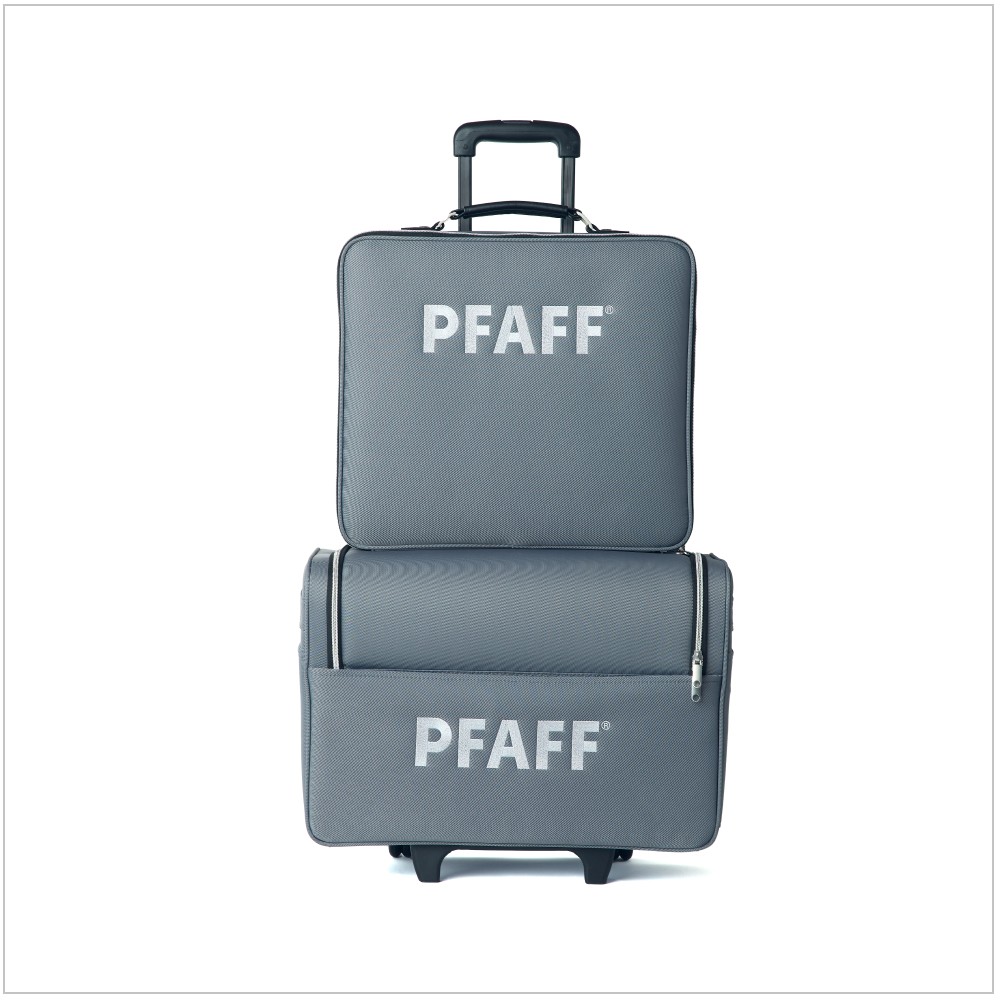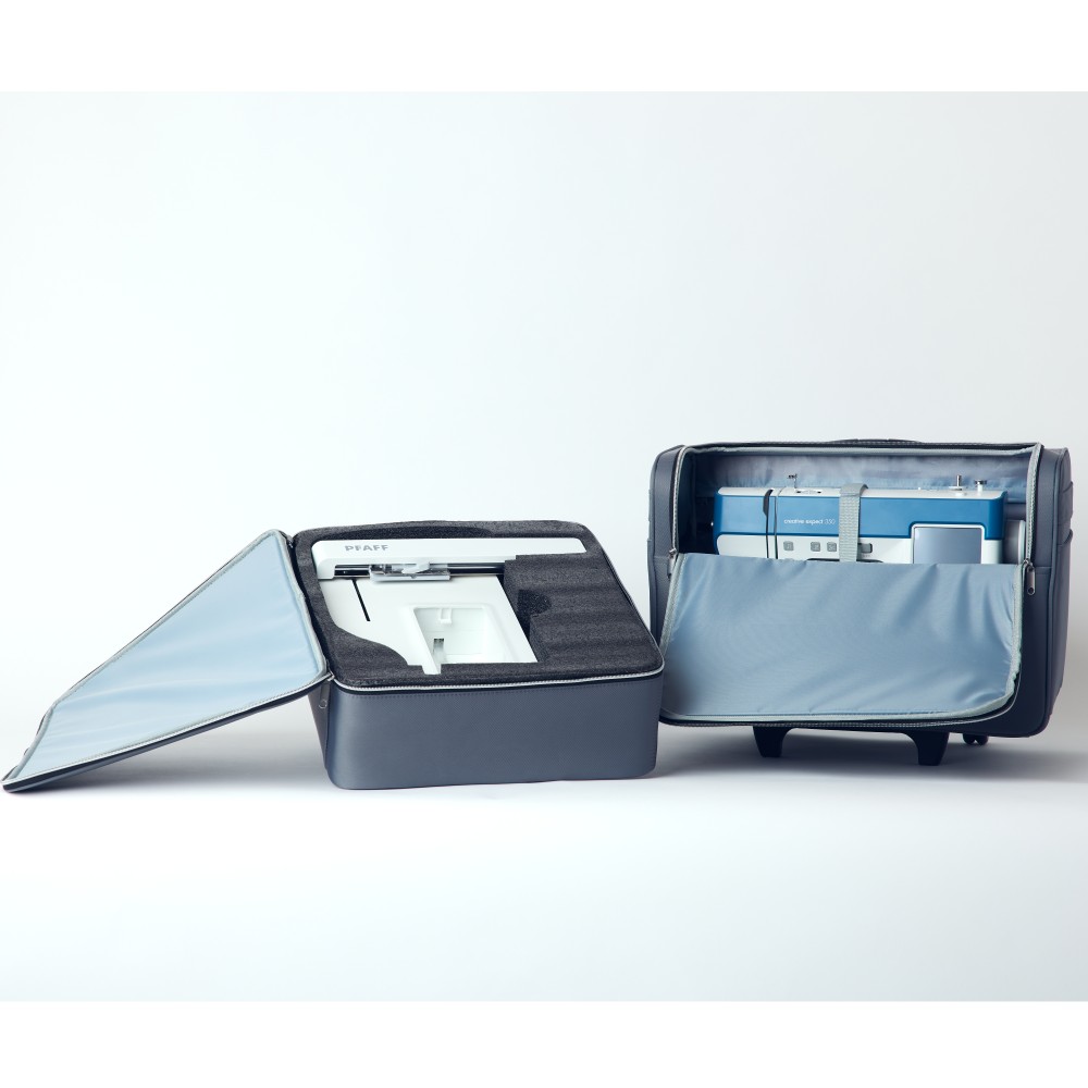Ontworpen om de PFAFF® creative expect™ 350 naai- en borduurmachine te beschermen en te vervoeren. Tot de topklasse kenmerken behoren hoogwaardige stof en een verlenghandvat met wieltjes voor eenvoudig transport. De tas voor de borduureenheid heeft een riem aan de achterkant, waardoor hij gemakkelijk aan de tas voor de machine kan worden bevestigd. Inclusief grote vakken voor het opbergen van accessoires.