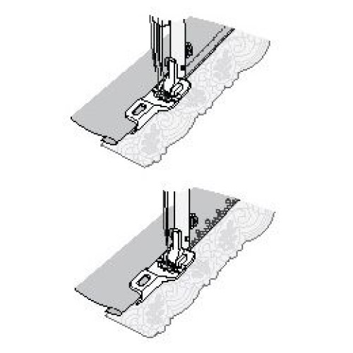 U kunt de naai- en vouwvoet gebruiken voor verschillende soorten randen, zoals kant en geborduurde randen of om in combinatie met verschillende stoffen en de prachtige HUSQVARNA® VIKING® 7 mm steken prachtige randen te maken. Zo maakt u in een handomdraai lingerie, prachtige zakdoeken met kanten randjes of elegante tafelkleden. Deze naaivoet geleidt de rand en de basisstof soepel door de openingen in de voorkant van de voet, vouwt de basisstof en naait de rand tegelijkertijd vast.