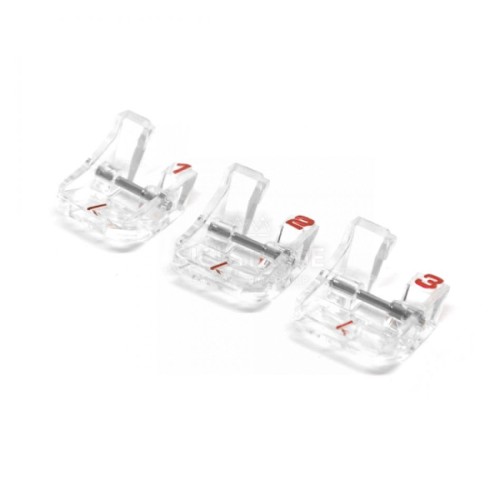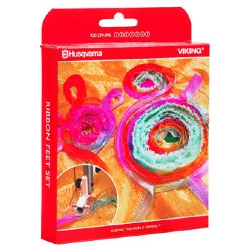 Met de HUSQVARNA® VIKING® naaivoetenset voor linten is het naaien van mooi versierde linten heel gemakkelijk. De set bevat drie naaivoeten die geschikt zijn voor linten in verschillende breedtes (van 6 tot 13,5 mm).