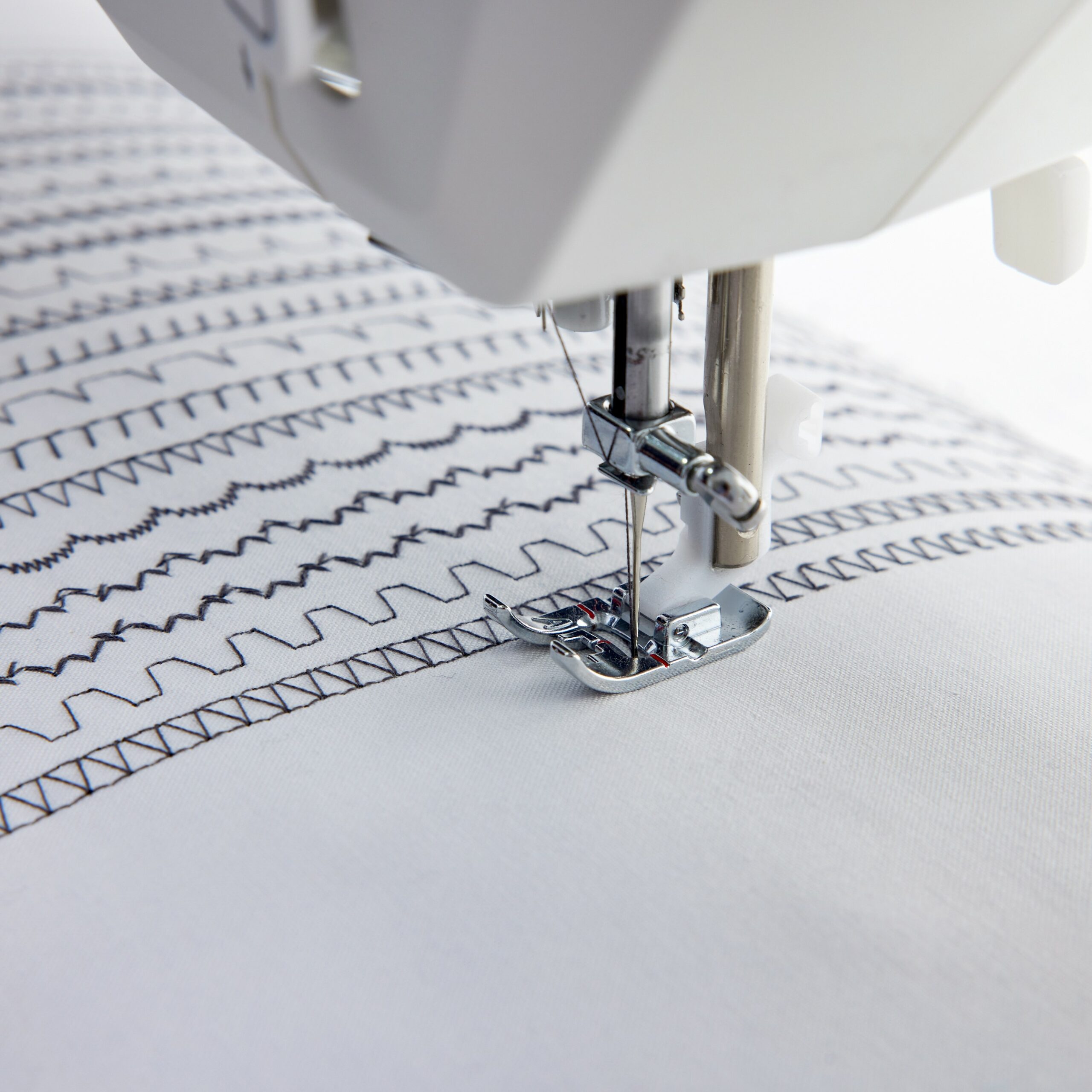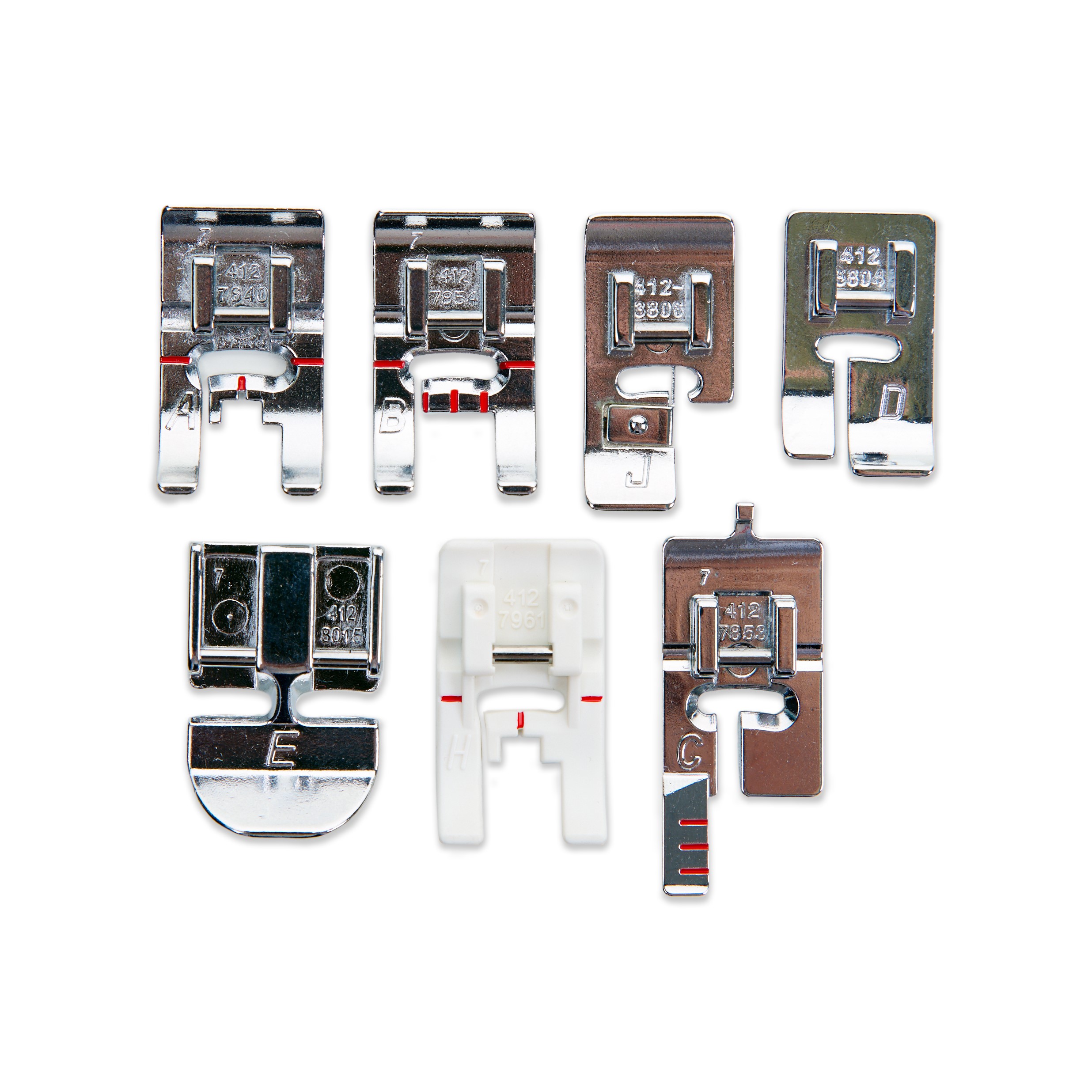 De machine wordt geleverd inclusief 7 naaivoeten. De standaard naaivoet is bevestigd bij aflevering van de machine. Daarnaast zijn er nog 6 andere naaivoeten voor verschillende technieken: knoopsgatenvoet, cordonsteekvoet voor decoratieve steken, blindzoomvoet, ritsvoet, glijvoet en overlockvoet.
