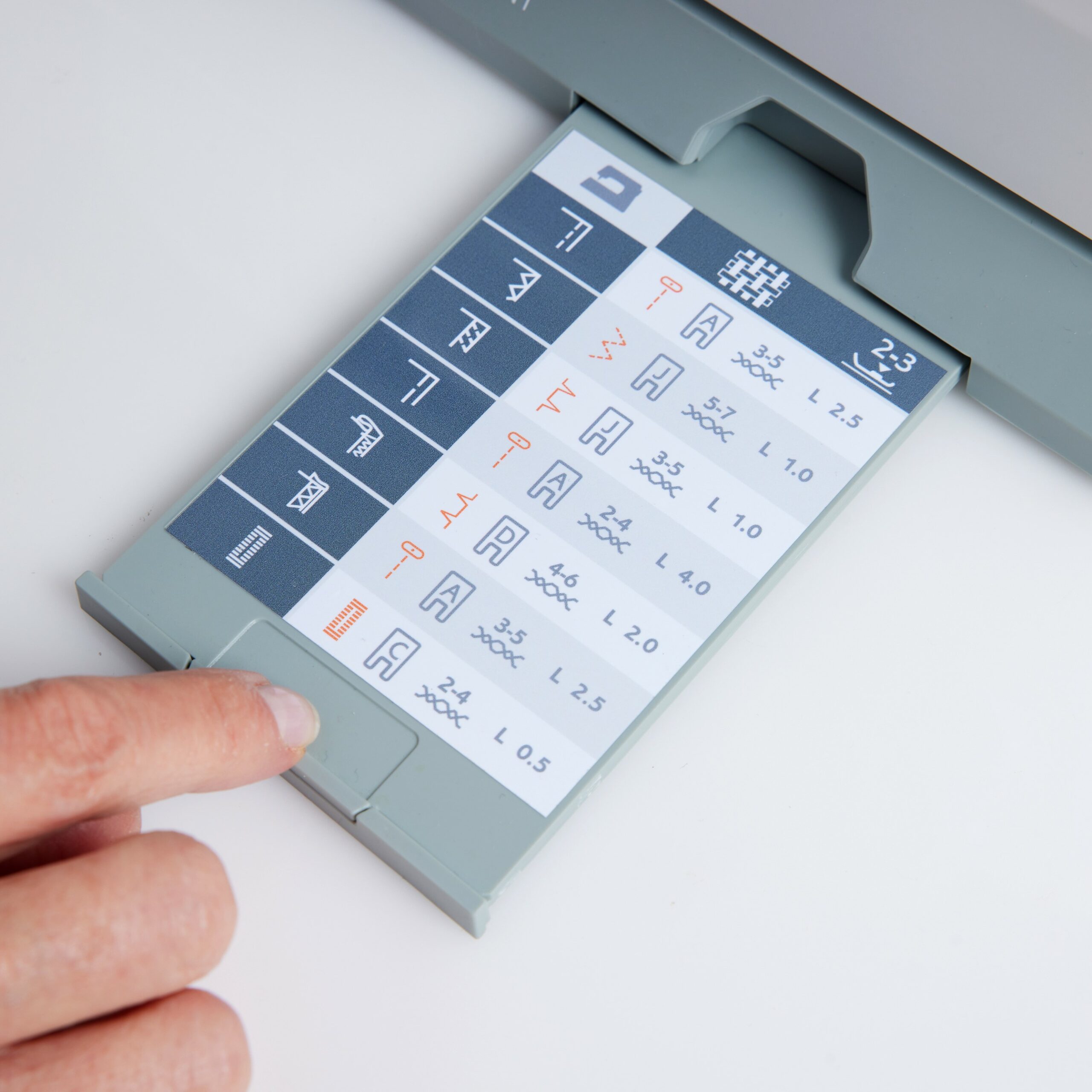 Advies nodig? Kijk op de naaigids! Deze helpt u met de juiste instellingen. U schuift hem heel eenvoudig onder de naaimachine vandaan.