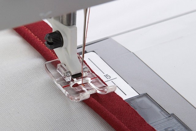 De mogelijkheid om originele HUSQVARNA® VIKING® naaivoeten te gebruiken geeft u toegang tot veel optionele naaivoeten zodat u uw naaivaardigheden kunt verkennen en ontwikkelen. (Afgebeeld: Optionele transparante passepoilvoet 413 097 145).