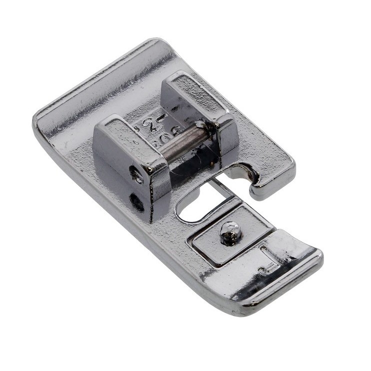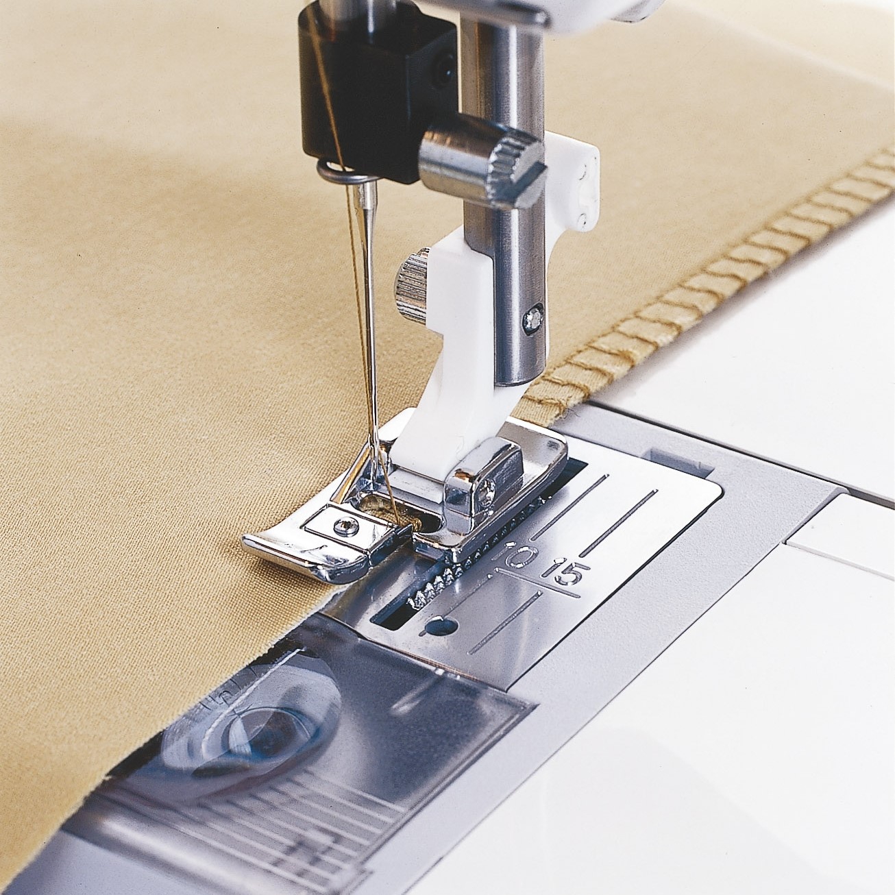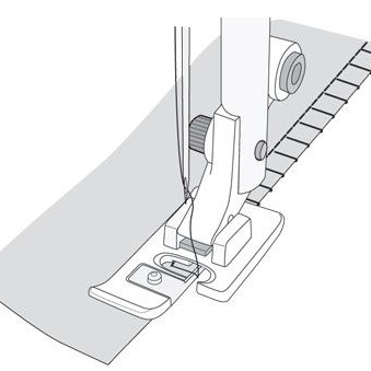 Overlockvoet J wordt gebruikt voor het afwerken van stofranden waarbij het gevaar bestaat dat de stof gaat samentrekken of omkrullen. Het dunne geleidertje aan de zijkant van de voet voorkomt het omkrullen of rimpelen van de stof. Deze voet is geschikt voor diverse overlock- en randafwerksteken.