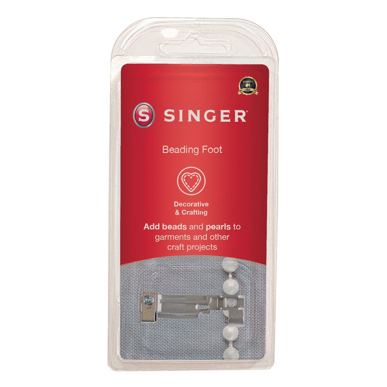 Voor uw lockmachine. Breng eenvoudig kralen, pareltjes, lovertjes en andere versieringen aan op projecten. De kralen worden op hun plaats gebracht dankzij de geleider en de groef op de naaivoet.