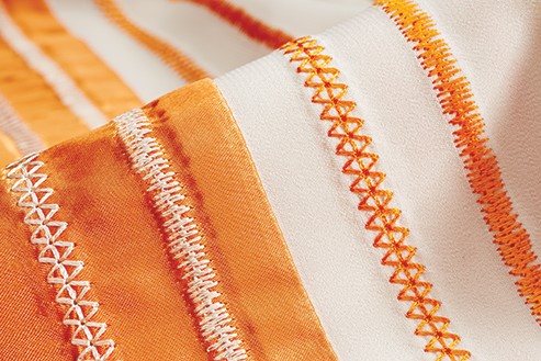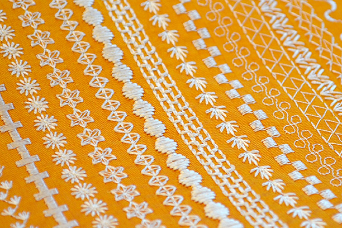 Een groot aantal verschillende prachtige 7 mm-steken, inclusief nuttige steken, knoopsgaten, decoratieve steken, quiltsteken, naaldkunststeken en cordonsteken.