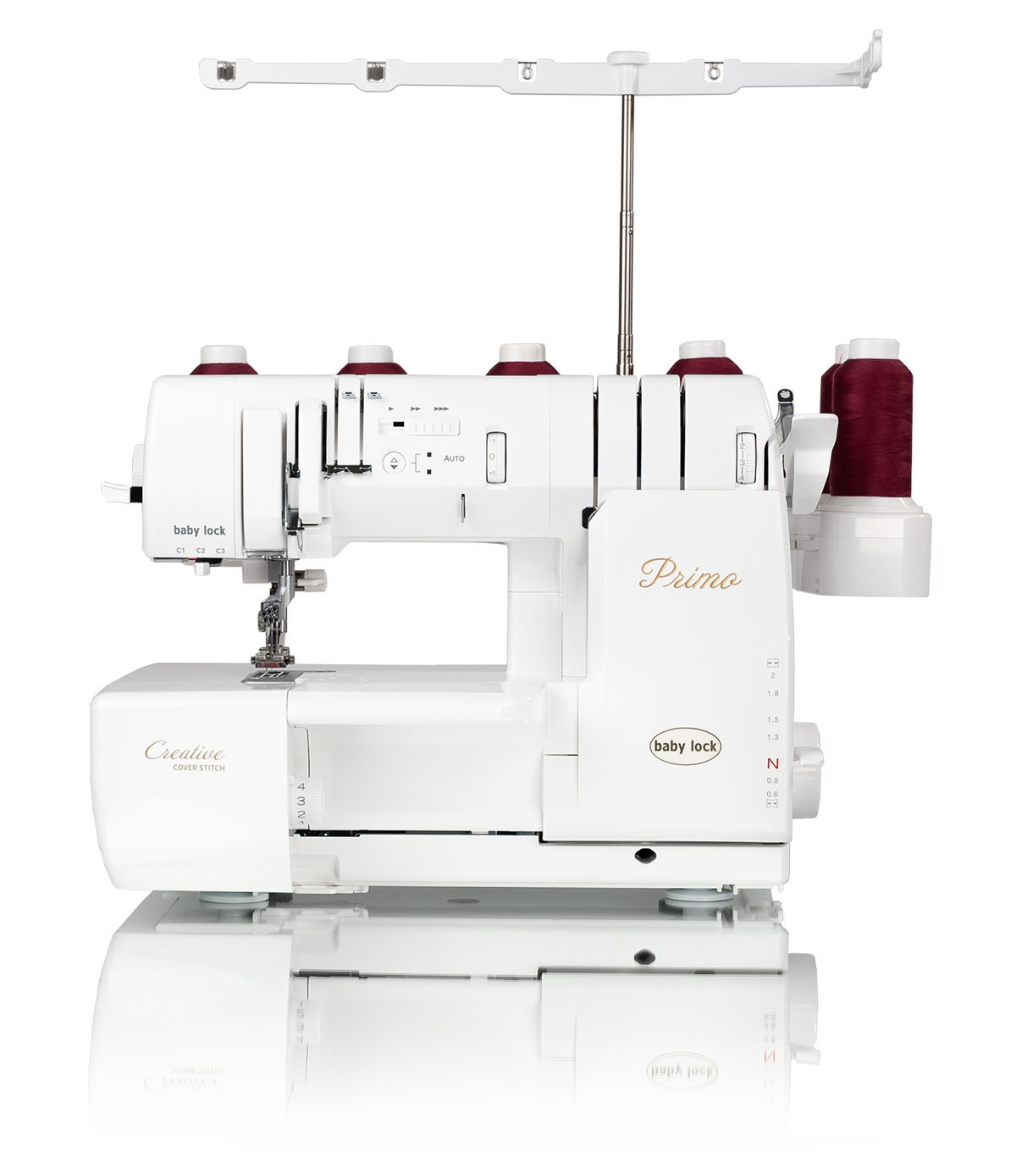 De pendelende naaivoet van de Primo verschilt van de standaard naaivoet van de meeste covermachines. Omdat de draaddoorvoer in de naaivoet is geïntegreerd, worden de schacht en de naaivoet tot één geheel gecombineerd. Het resultaat: een prachtig slingerende decoratieve steek. Het aantal gebruikte naalden en draden kan gemengd en gematcht worden om in totaal acht verschillende naadvariaties te creëren – van smal en delicaat tot weelderig en decoratief. Natuurlijk beheerst de baby lock Primo het volledige repertoire van klassieke covernaden.