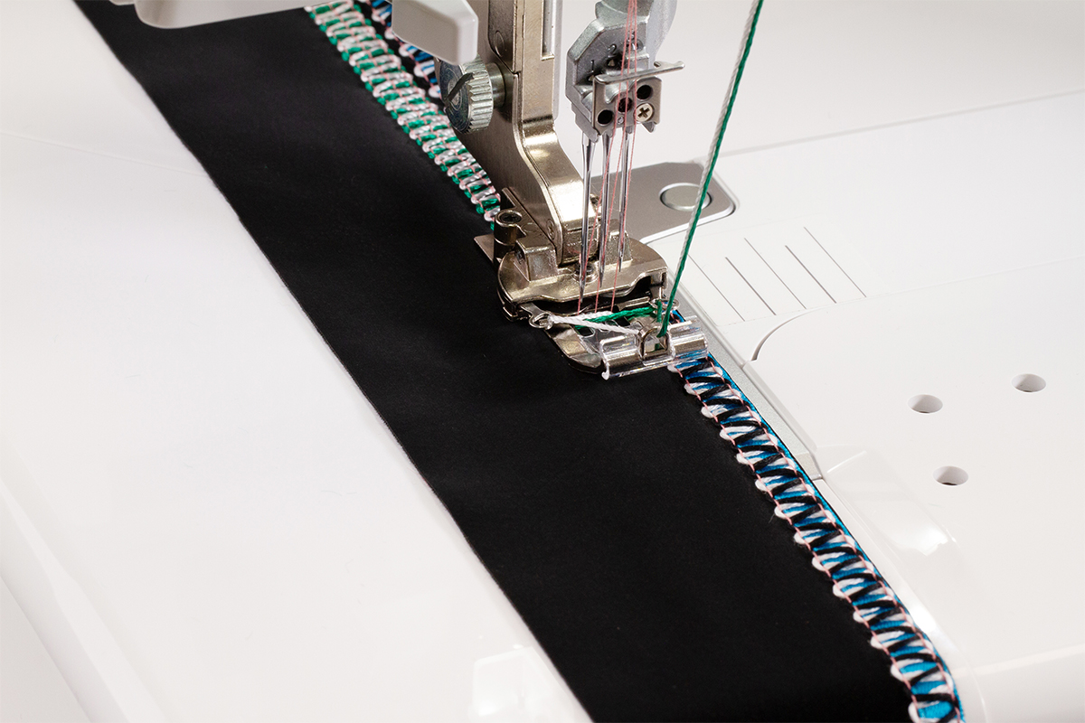 Wanneer de naaivoet omhoog wordt gebracht, zakt de transporteur automatisch. Deze technologie zorgt ervoor dat covernaden moeiteloos kunnen worden afgewerkt. De afstand tussen de naaivoet en de transporteur wordt vergroot, waardoor de stof gemakkelijker kan worden verplaatst. Terwijl je op de stof naait tijdens het coveren, kan de naad individueel worden afgewerkt waar jij dat wilt of waar het naaiproject dat vereist.