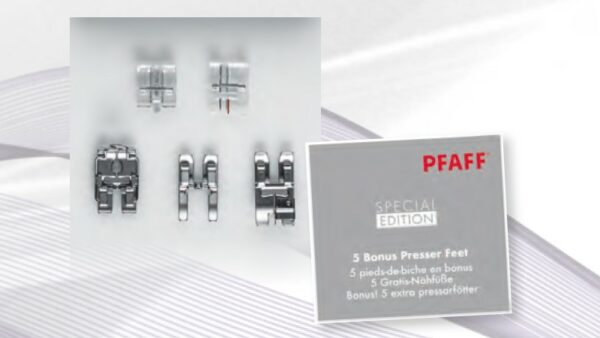 Exclusieve set met 5 bonus naaivoeten: Smalle kantstikvoet voor IDT™-systeem; Blinde ritsvoet; Paspelvoet; Soutachevoet voor IDT™-systeem en Open applicatievoet voor IDT™-systeem. Zolang de voorraad strekt.