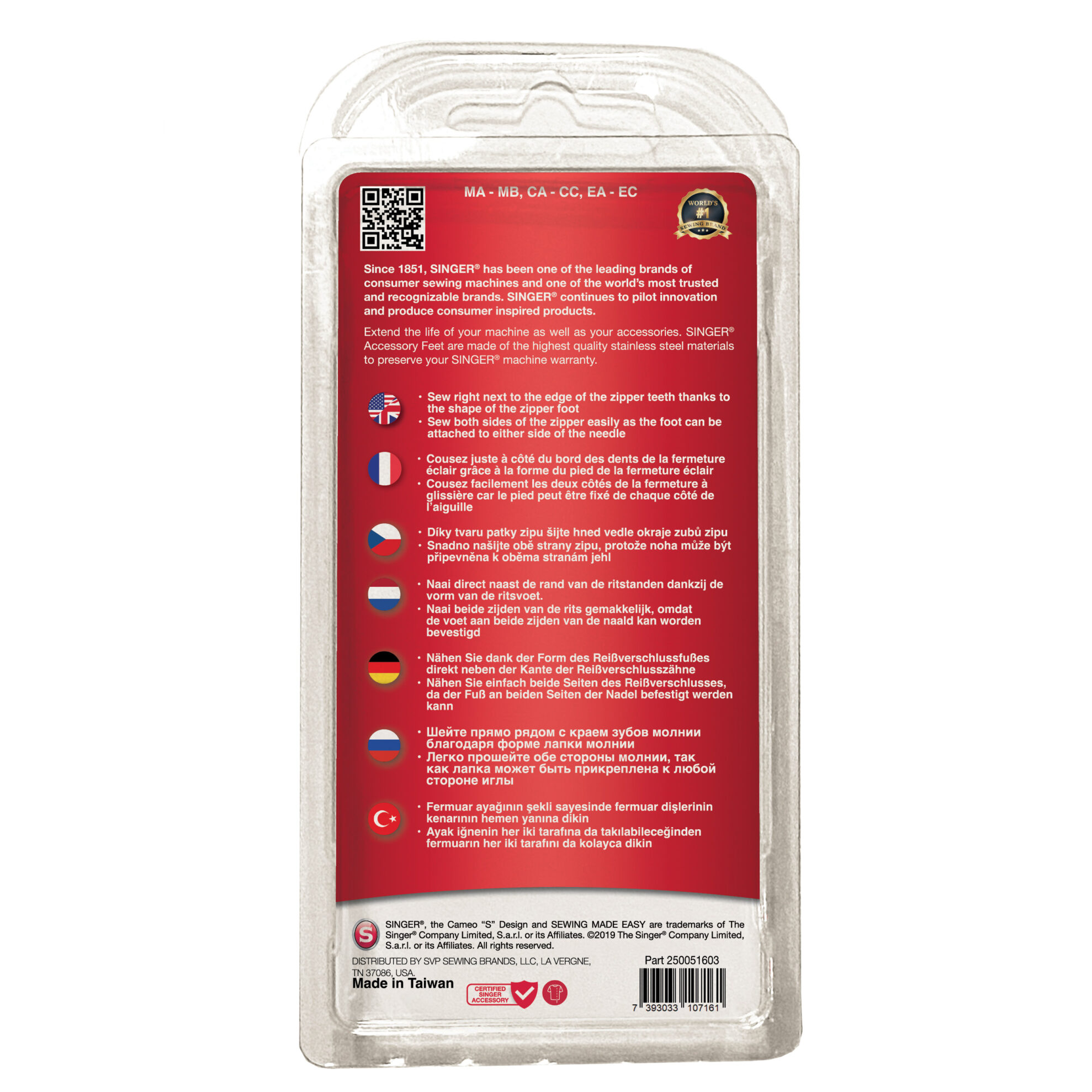 Naai direct naast de rand van de ritstanden dankzij de vorm van de ritsvoet. Naai beide zijden van de rits gemakkelijk, omdat de voet aan beide zijden van de naald kan worden bevestigd.