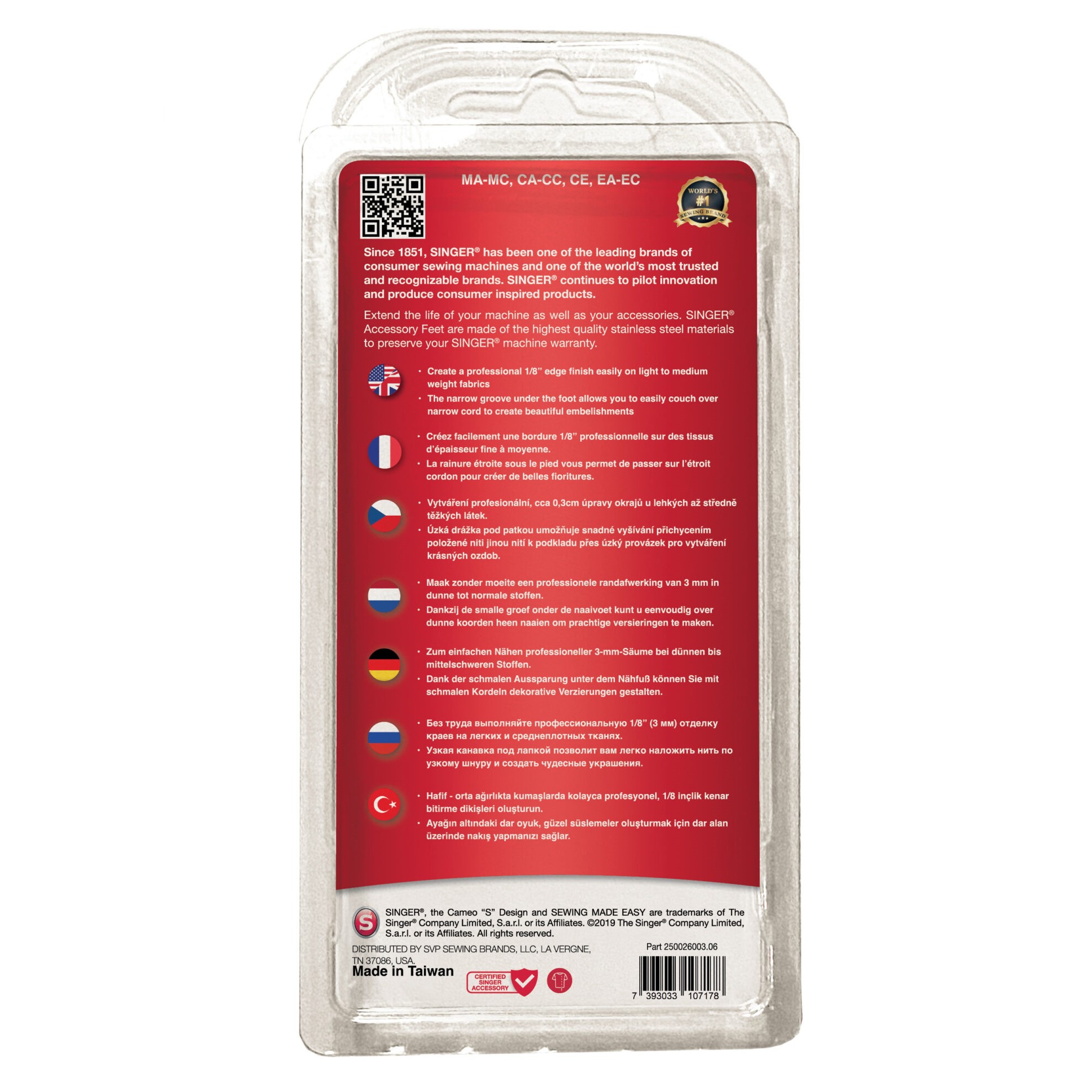 De rolzoomvoet is ideaal voor het netjes afwerken van stofranden met een rolzoom van 3 mm. Dunne en fijne stoffen zijn hier het meest geschikt voor. Gebruik de rolzoomvoet om mooie randen met een professionele uitstraling te naaien aan ruches, sjaals, tafellinnen en nog veel meer.