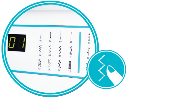 U hoeft niet naar steken te zoeken, druk gewoon op het pictogram van de steek die u wilt naaien en begin.