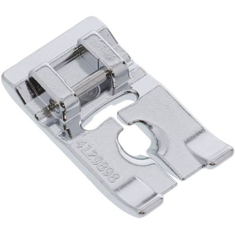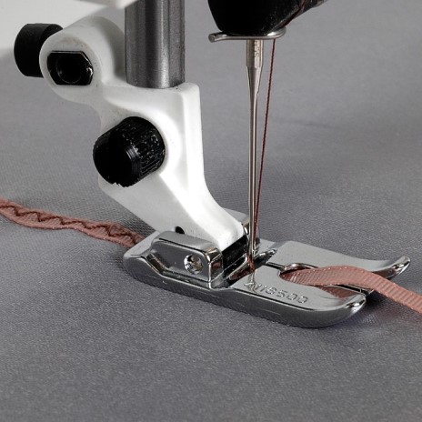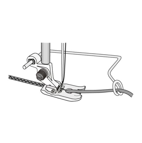 2. Laat de voet zakken en naai het bandje vast. Met de optionele contourdraad/soutachegeleider (412554445) wordt het bandje op zijn plaats gehouden.