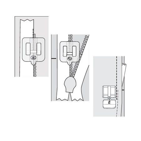 12. Klik de normale ritsvoet E vast aan de linkerkant van de naald. Pas de naaldpositie aan indien nodig.