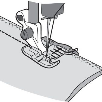 6. Zet de naaivoet omlaag en begin met naaien. De geleider volgt de rand van de stof en de steek wordt met een perfect rechte naadtoeslag genaaid.