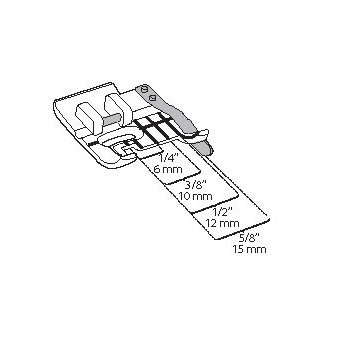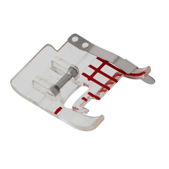 De transparante zoomgeleidevoet geleidt de steek langs de rand bij het aan elkaar naaien van de stof. De naadtoeslagen worden overal even breed. Er is een metalen geleider plus vier verschillende lijnen voor diverse naadtoeslagen. Voor machinegroep 9 is er een transparante zoomgeleidevoet, geschikt voor het IDF™-systeem (920614096).