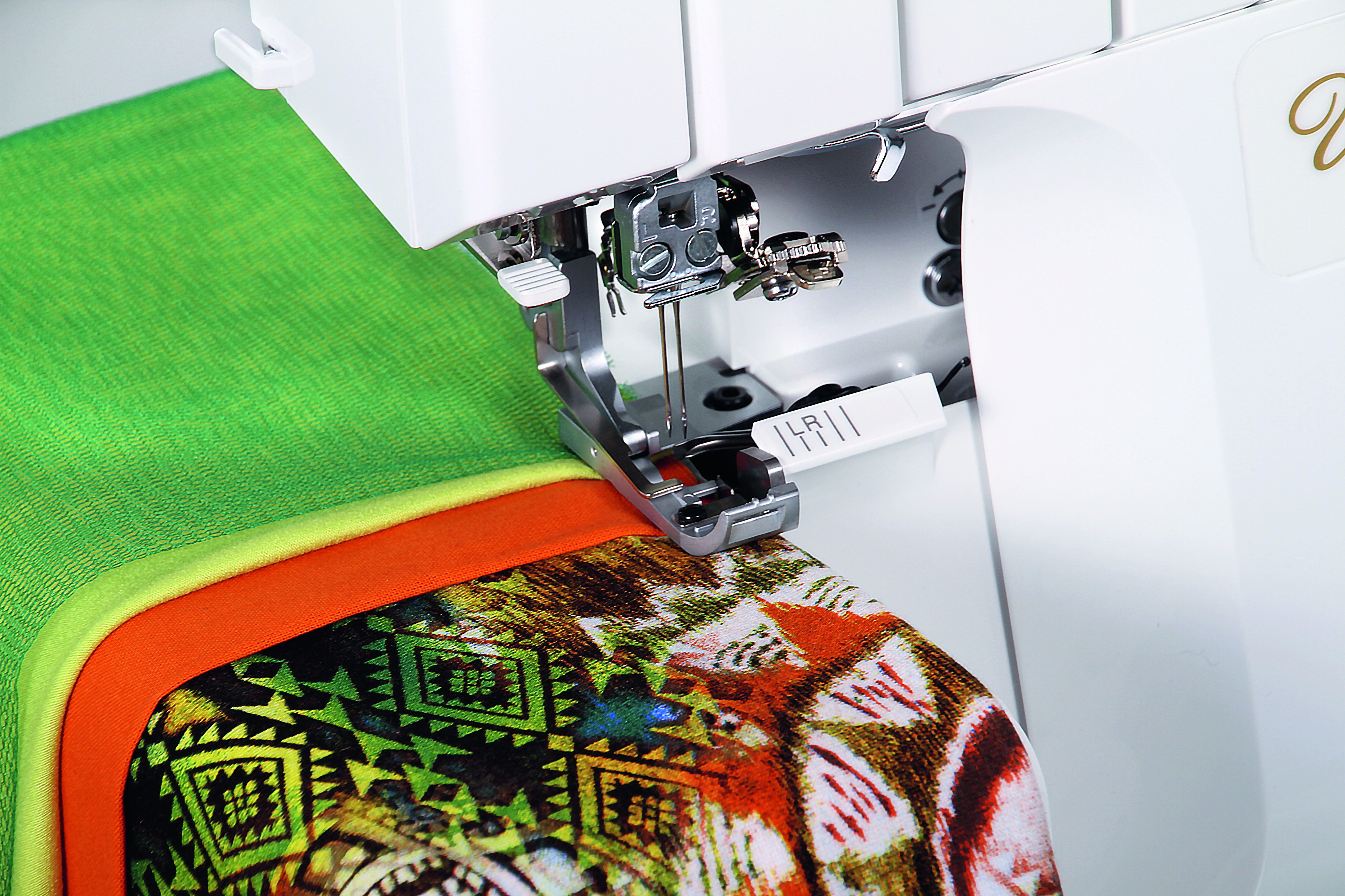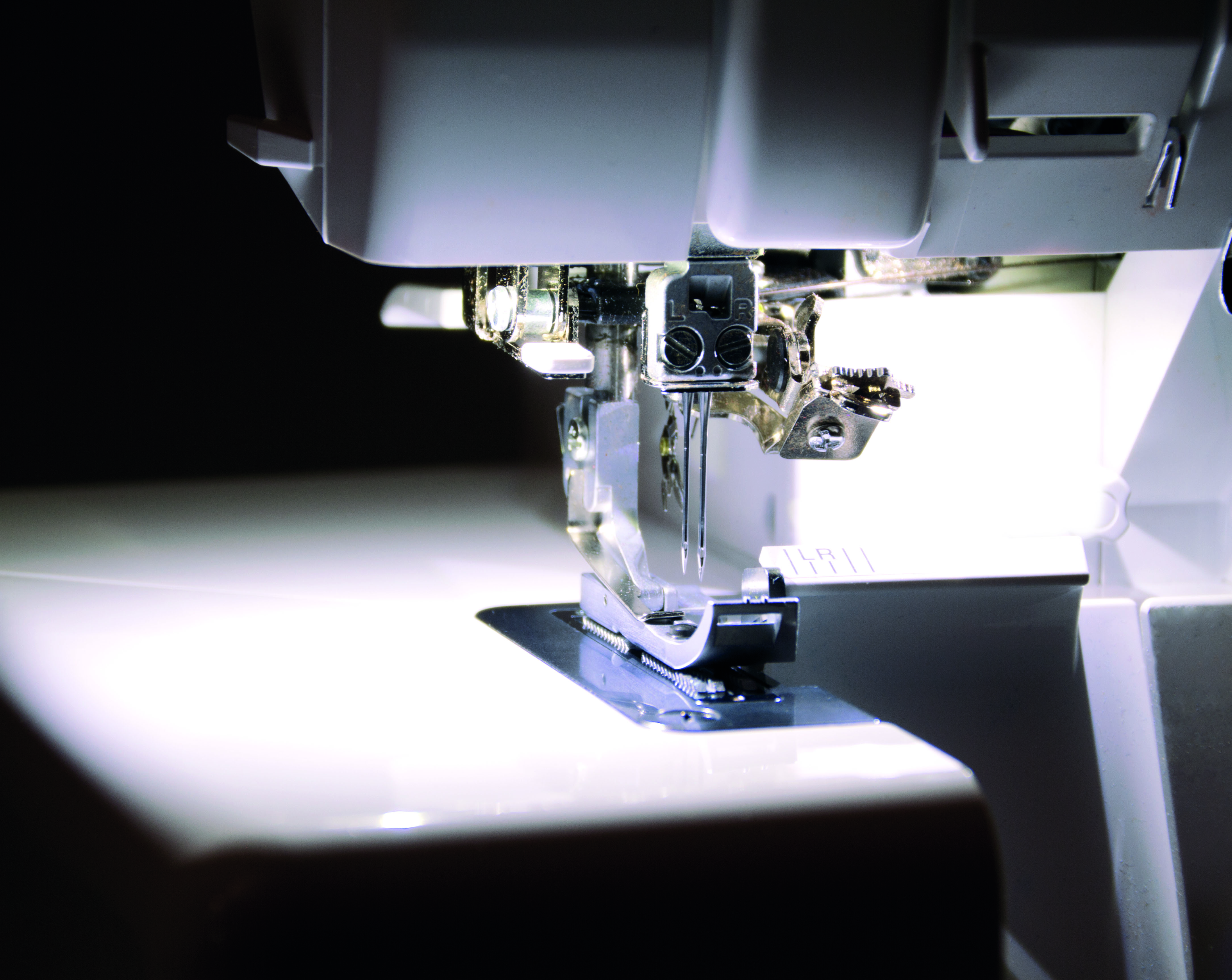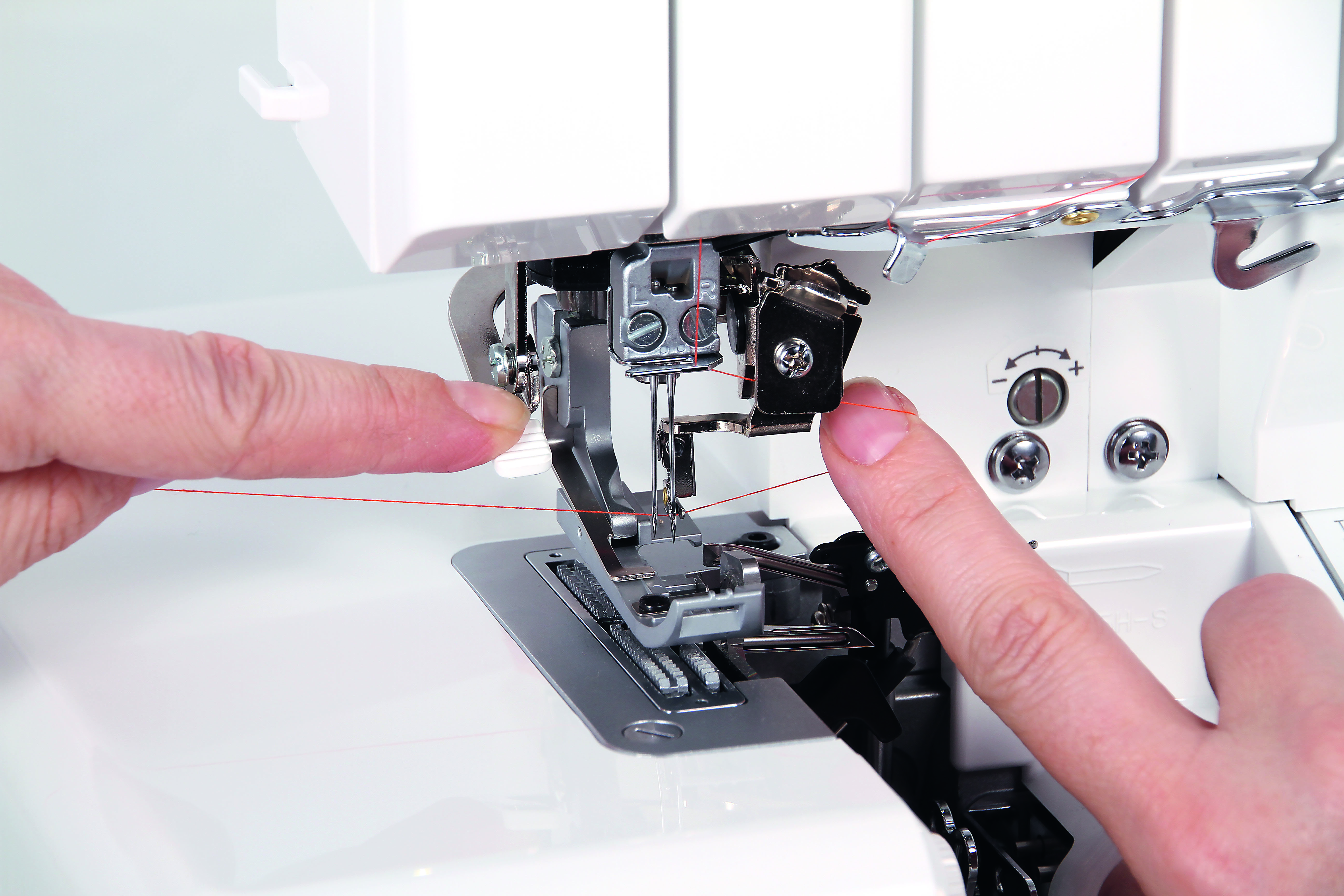 Wanneer de knop voor het aanpassen van de steekbreedte met de klok mee of tegen de klok in wordt ingedrukt, bewegen de kettingtong en het bovenmes synchroon naar rechts of links. Dankzij deze speciale technologie kan de naadbreedte eenvoudig worden aangepast. De daadwerkelijke naadbreedte wordt gewijzigd en niet alleen de snijbreedte, zoals gewoonlijk het geval is. Over- of ondersnijdingen worden voorkomen en het is niet nodig om de hoeveelheid lusdraad aan te passen. De steek wordt breder of smaller zonder vervelende en tijdrovende aanpassingen.